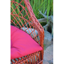 Prírodné prútené kreslo do záhrady s červenou poduškou