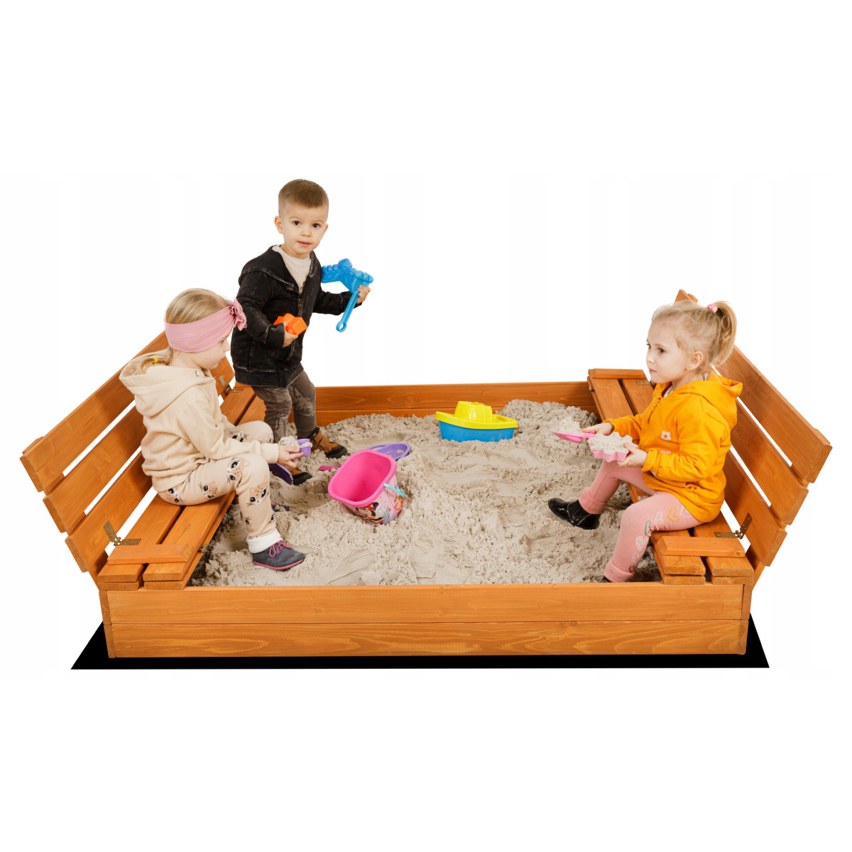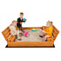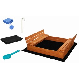 Pieskovisko je vybavené dvoma lavičkami s operadlami. Po skončení hry sa lavičky jednoducho sklopia a vytvoria pevný ochranný kryt.