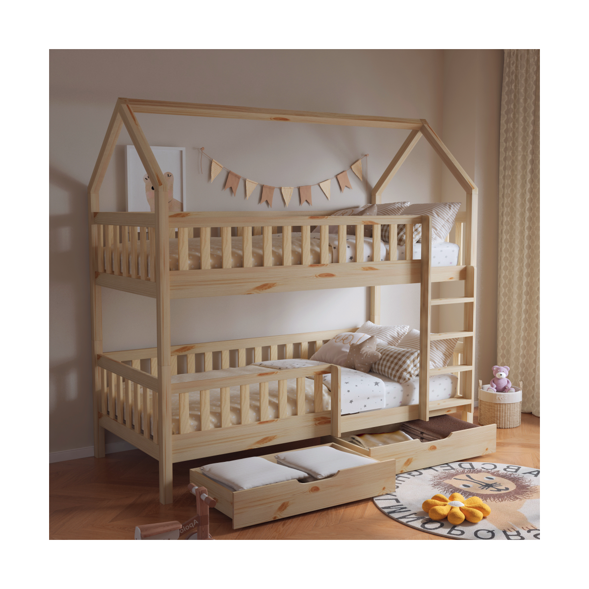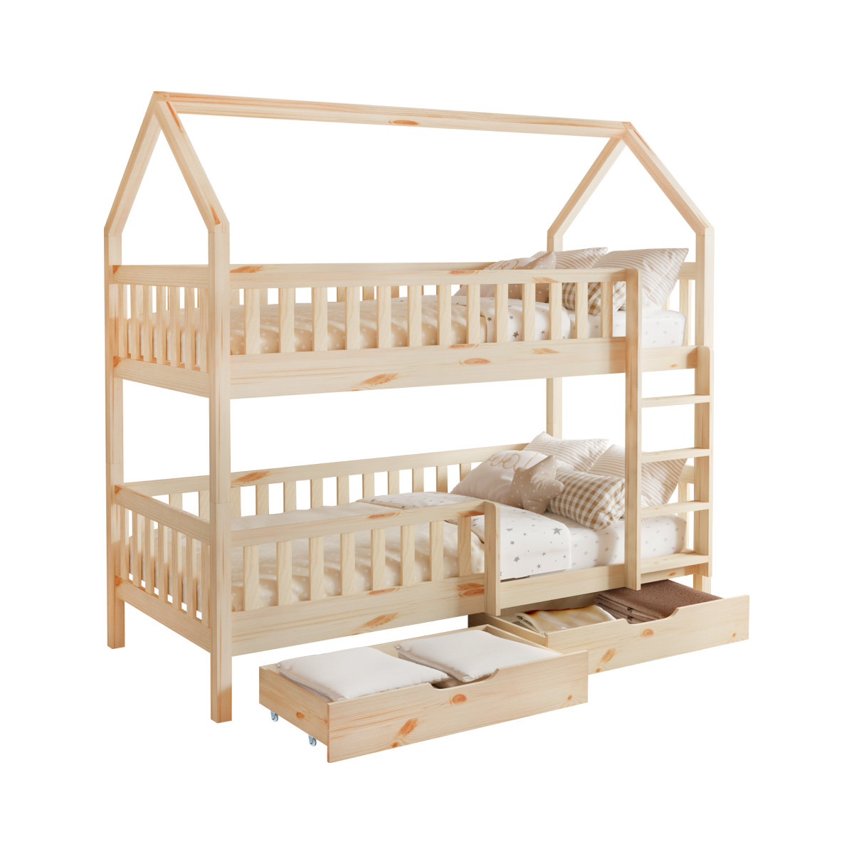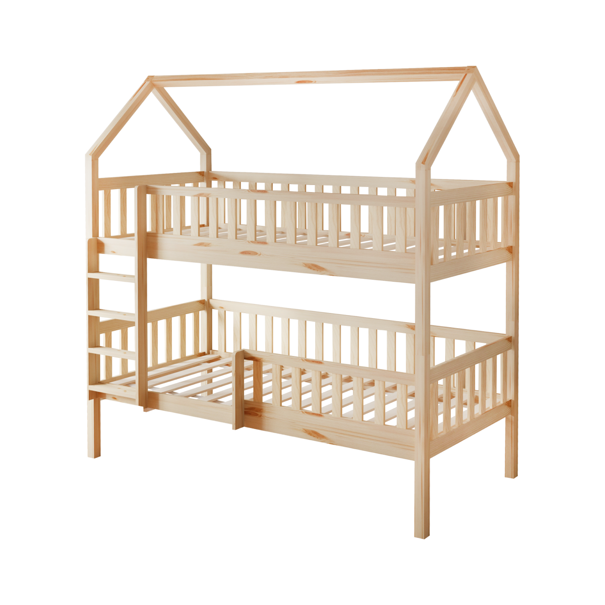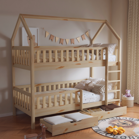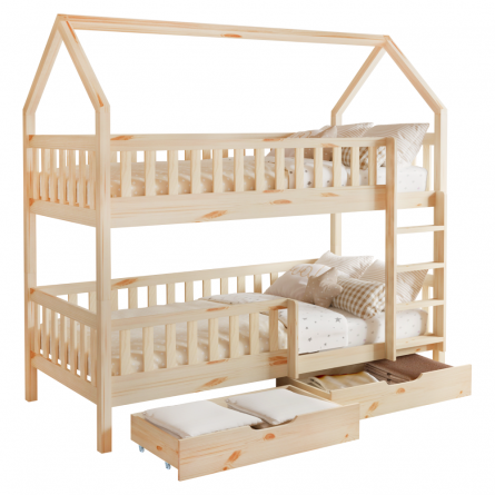 Poschodová posteľ VENITA TYP 2 v tvare domčeka je skvelým riešením do detských izieb, kombinuje funkčnosť, bezpečnosť a očarujúci dizajn. Je vyrobená z masívneho borovicového dreva v prírodnom farebnom prevedení, vďaka čomu sa ľahko prispôsobí akémukoľvek štýlu interiéru. Vďaka jednoduchému dizajnu a čistým líniám skvelo vynikne v akomkoľvek interiéri, a navyše je lakovaná ekologicky nezávadnými a umývateľnými farbami.