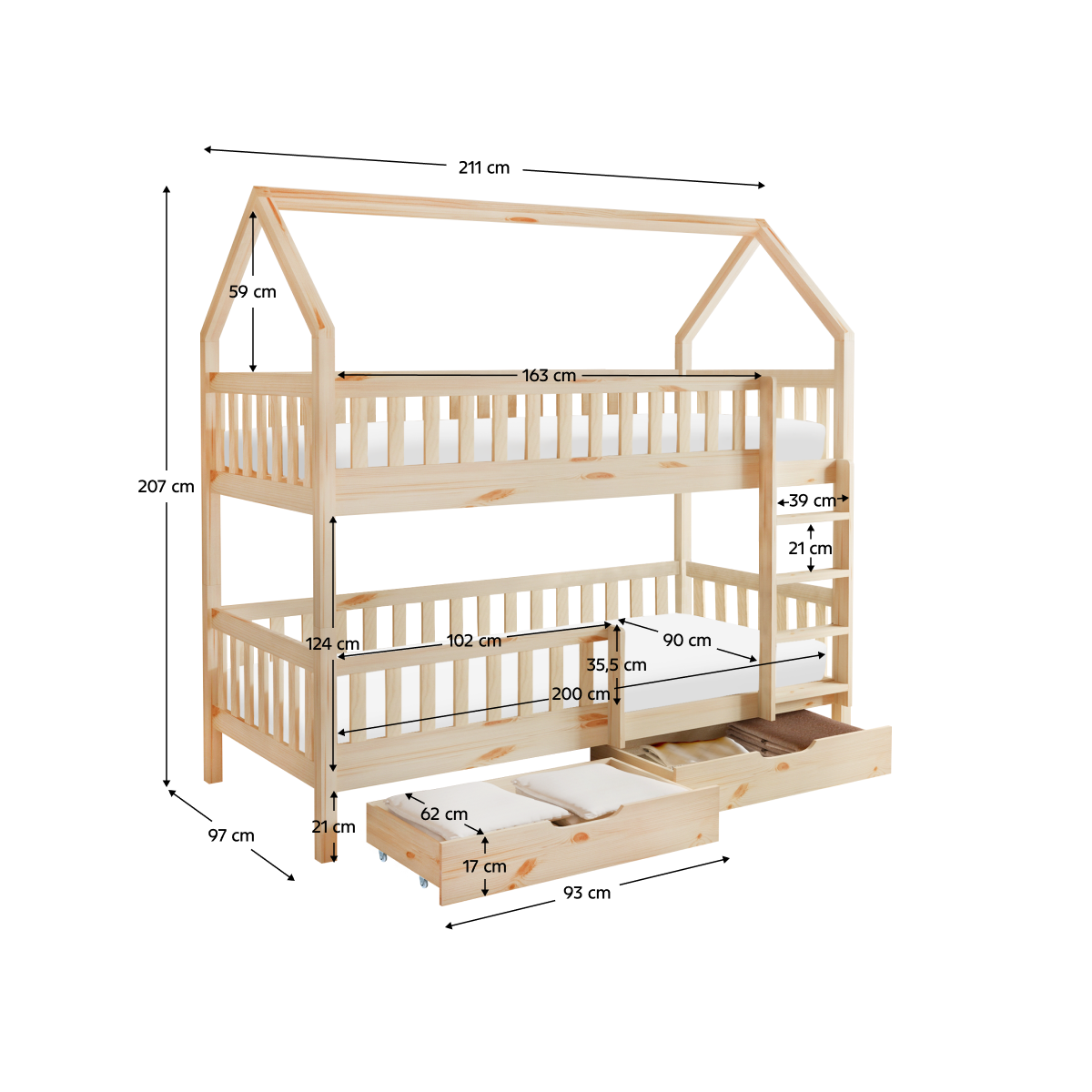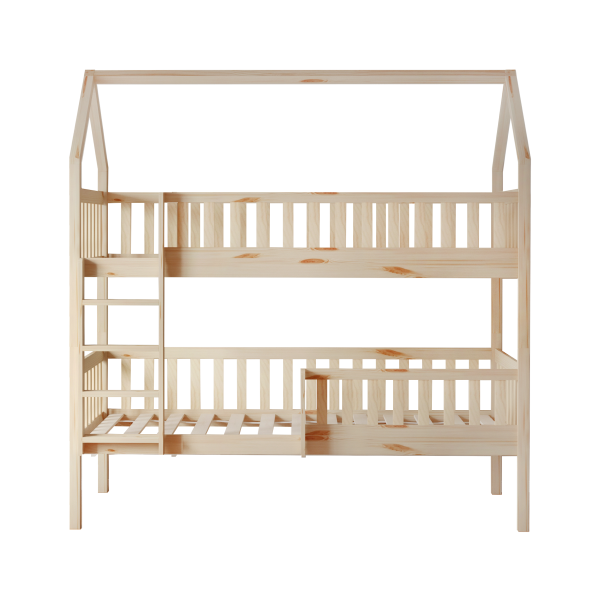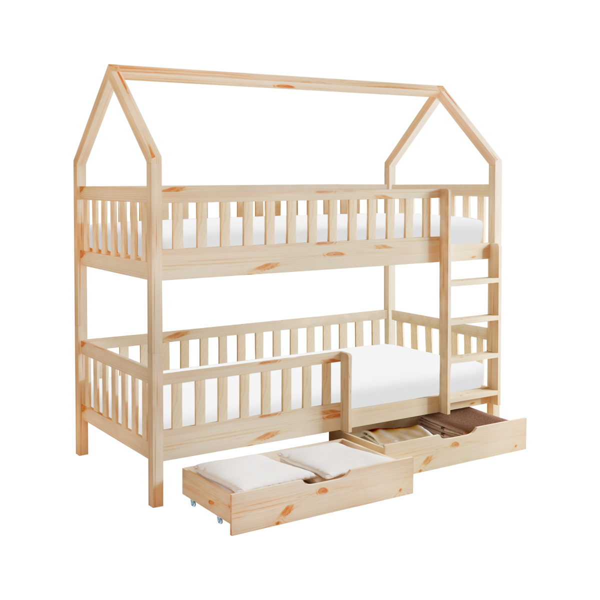 Poschodová posteľ VENITA TYP 2 v tvare domčeka je skvelým riešením do detských izieb, kombinuje funkčnosť, bezpečnosť a očarujúci dizajn. Je vyrobená z masívneho borovicového dreva v prírodnom farebnom prevedení, vďaka čomu sa ľahko prispôsobí akémukoľvek štýlu interiéru. Vďaka jednoduchému dizajnu a čistým líniám skvelo vynikne v akomkoľvek interiéri, a navyše je lakovaná ekologicky nezávadnými a umývateľnými farbami.