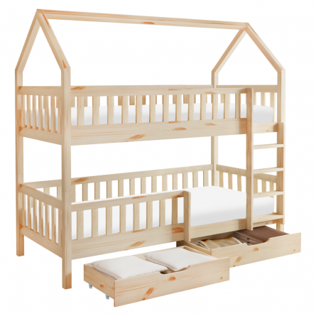 Táto posteľ je vytvorená s dôrazom na pohodlie a bezpečnosť detí. Horné lôžko je vybavené ochrannou bariérou, ktorá zaisťuje maximálnu bezpečnosť počas spánku, dolné lôžko má taktiež praktickú bariérku proti pádu. Rebrík je možné namontovať na pravú alebo ľavú stranu, čím sa posteľ stáva univerzálnou. Disponuje aj dvomi veľkými zásuvkami na kolieskach, ideálne na uskladnenie hračiek, kníh alebo posteľnej bielizne. Zaujme vás aj jej funkcia rozložiteľnosti, vďaka ktorej ju rozložíte na dve samostatné lôžka. Posteľ je dodávaná s rolovanými roštami, ale bez matraca. K posteli odporúčame zakúpiť pružinové matrace v rozmere 90x200 cm z našej ponuky. Pridajte do detskej izby funkčný a štýlový kúsok nábytku, ktorý spĺňa všetky praktické požiadavky a poteší deti svojím rozprávkovým dizajnom!