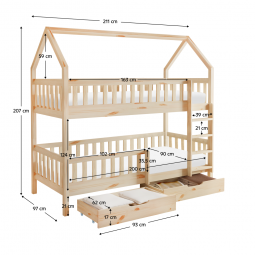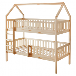 Poschodová posteľ VENITA TYP 1 v tvare domčeka je skvelým riešením do detských izieb, kombinuje funkčnosť, bezpečnosť a očarujúci dizajn. Je vyrobená z masívneho borovicového dreva v prírodnom farebnom prevedení, vďaka čomu sa ľahko prispôsobí akémukoľvek štýlu interiéru. Vďaka jednoduchému dizajnu a čistým líniám skvelo vynikne v akomkoľvek interiéri, a navyše je lakovaná ekologicky nezávadnými a umývateľnými farbami.