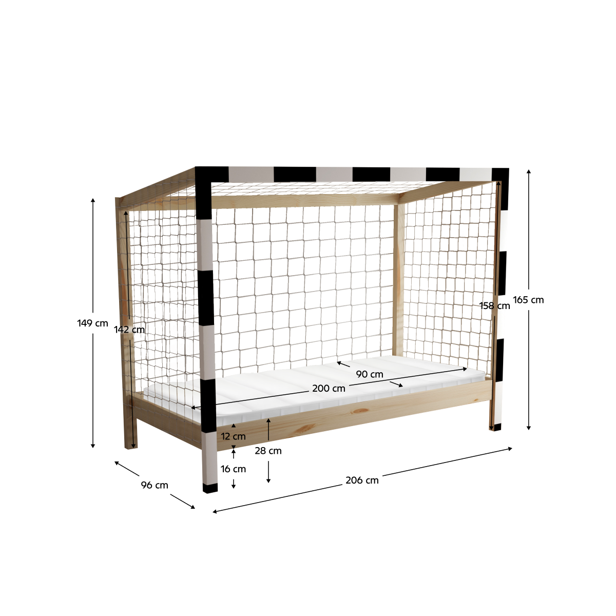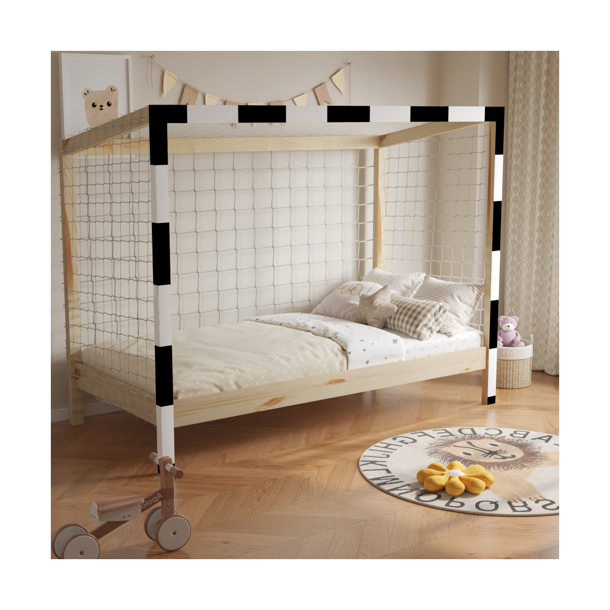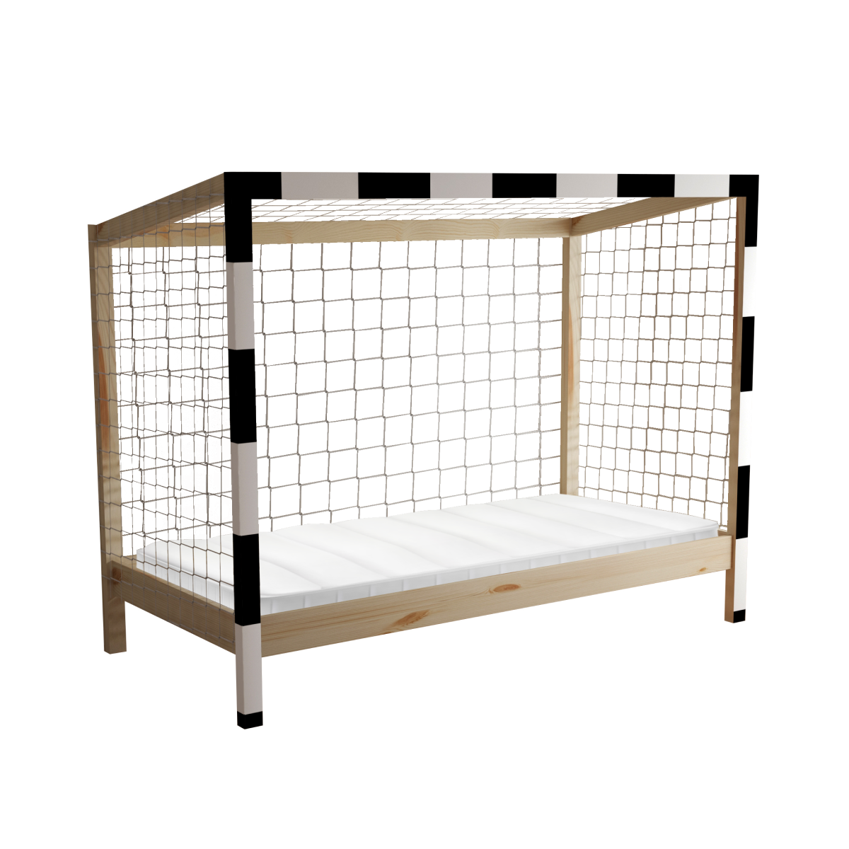 Súčasťou postele je aj biela sieť, ktorá chytí každý sen vášho malého športovca. Dodáva sa spolu s rolovaným preglejkovým roštom. Posteľ je dodávaná bez matraca. S montessori posteľou FUTAL sa stane každá noc nezabudnuteľným zápasom.