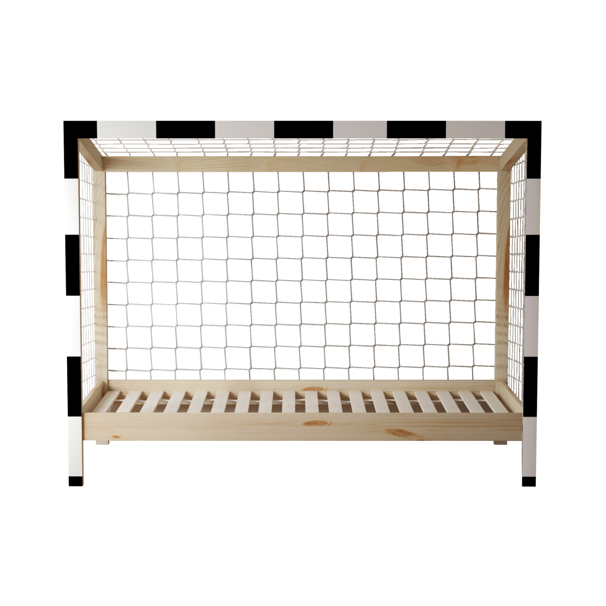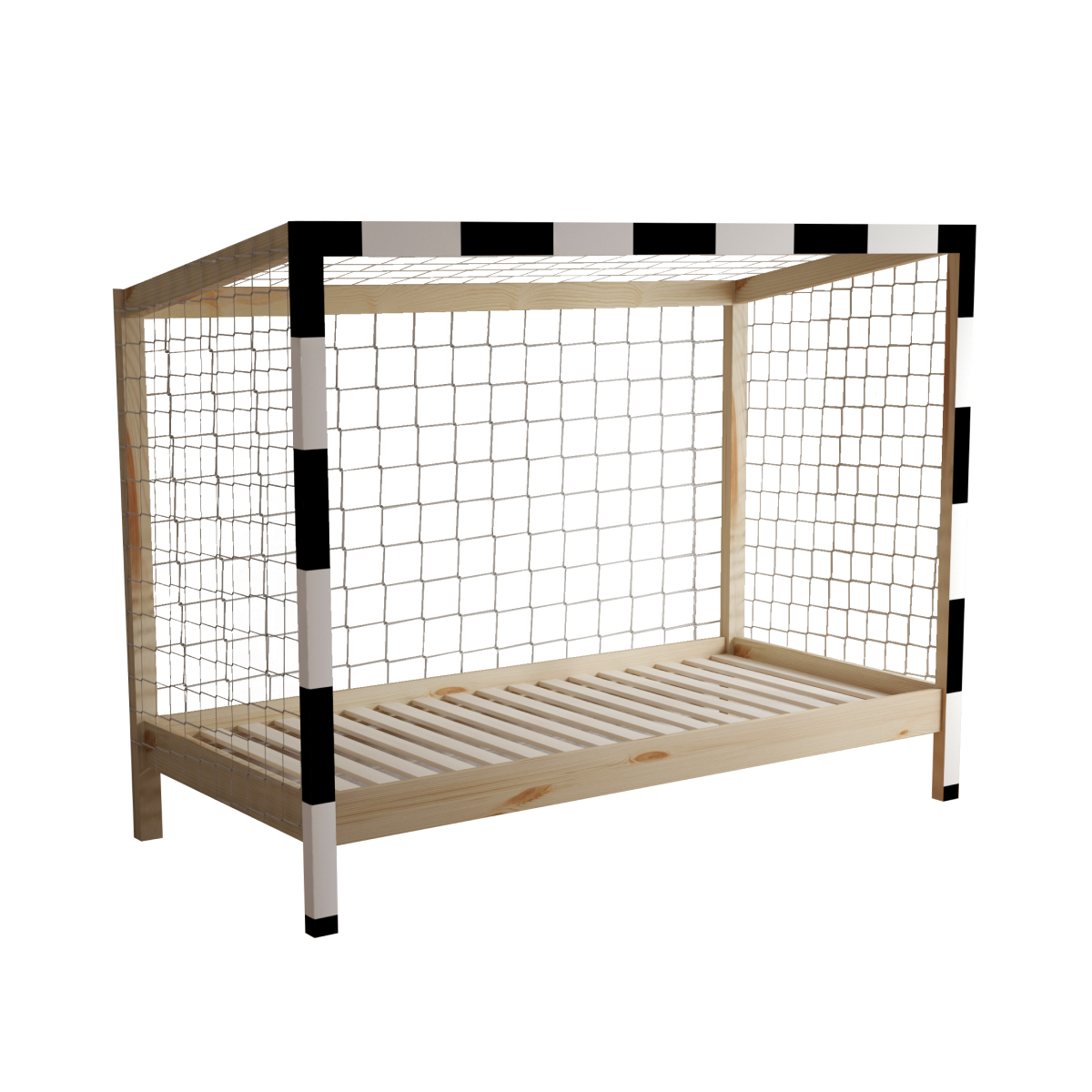 Montessori posteľ FUTAL v tvare futbalovej brány je snom nejedného malého futbalistu, ktorý túži po veľkých víťazstvách, športových výzvach, ale aj oddychu a odpočinku. Vyrobená je z kvalitného a vysoko odolného borovicového masívu v prírodnom farebnom prevedení. Predná časť postele, vďaka farebnej kombinácii bielej a čiernej navodí pocit pravej futbalovej atmosféry.