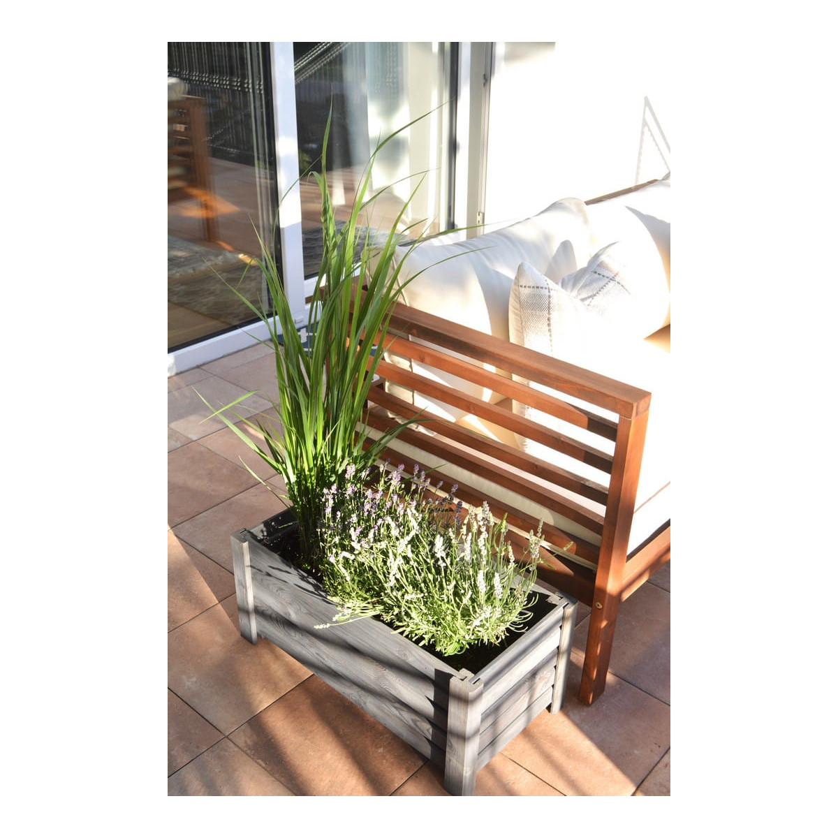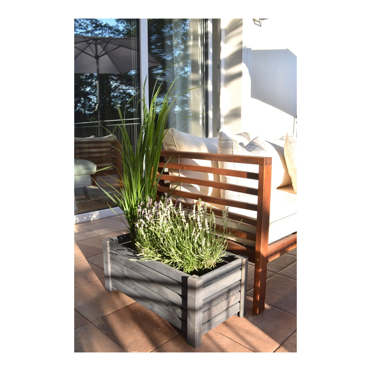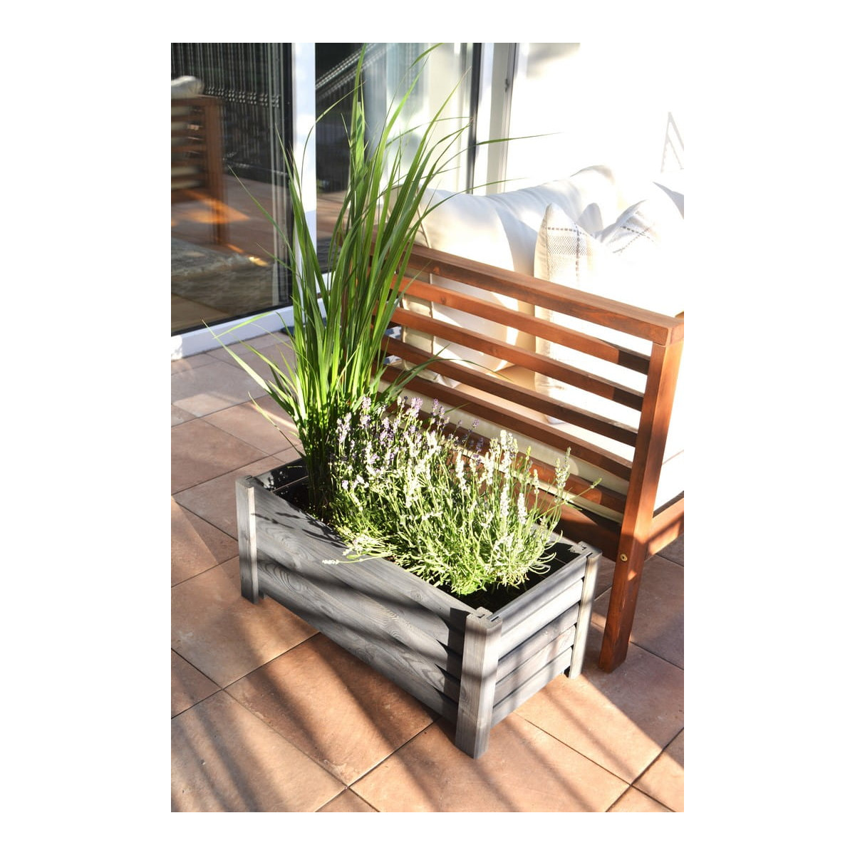 Vyvýšený drevený kvetináč v tmavo sivej farbe