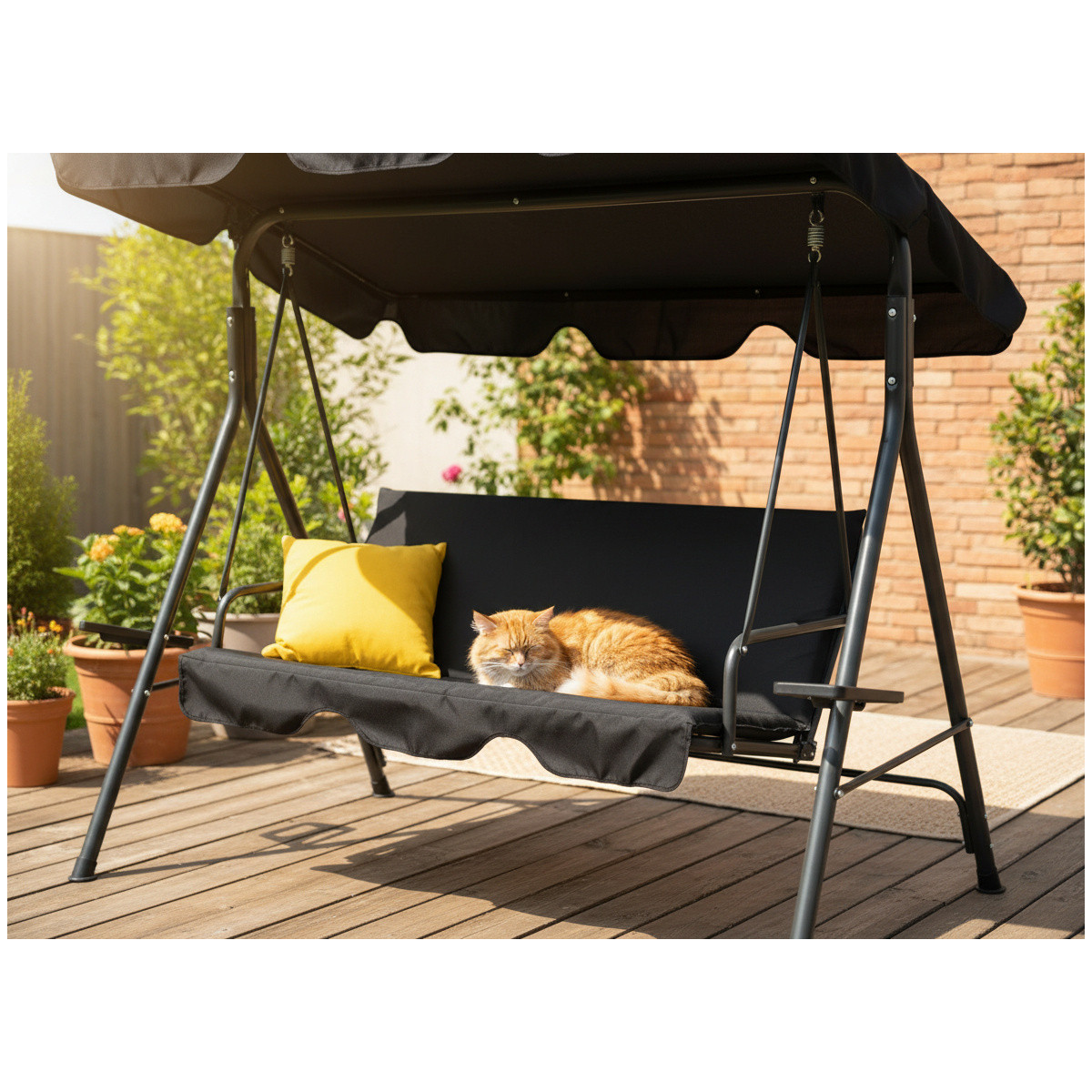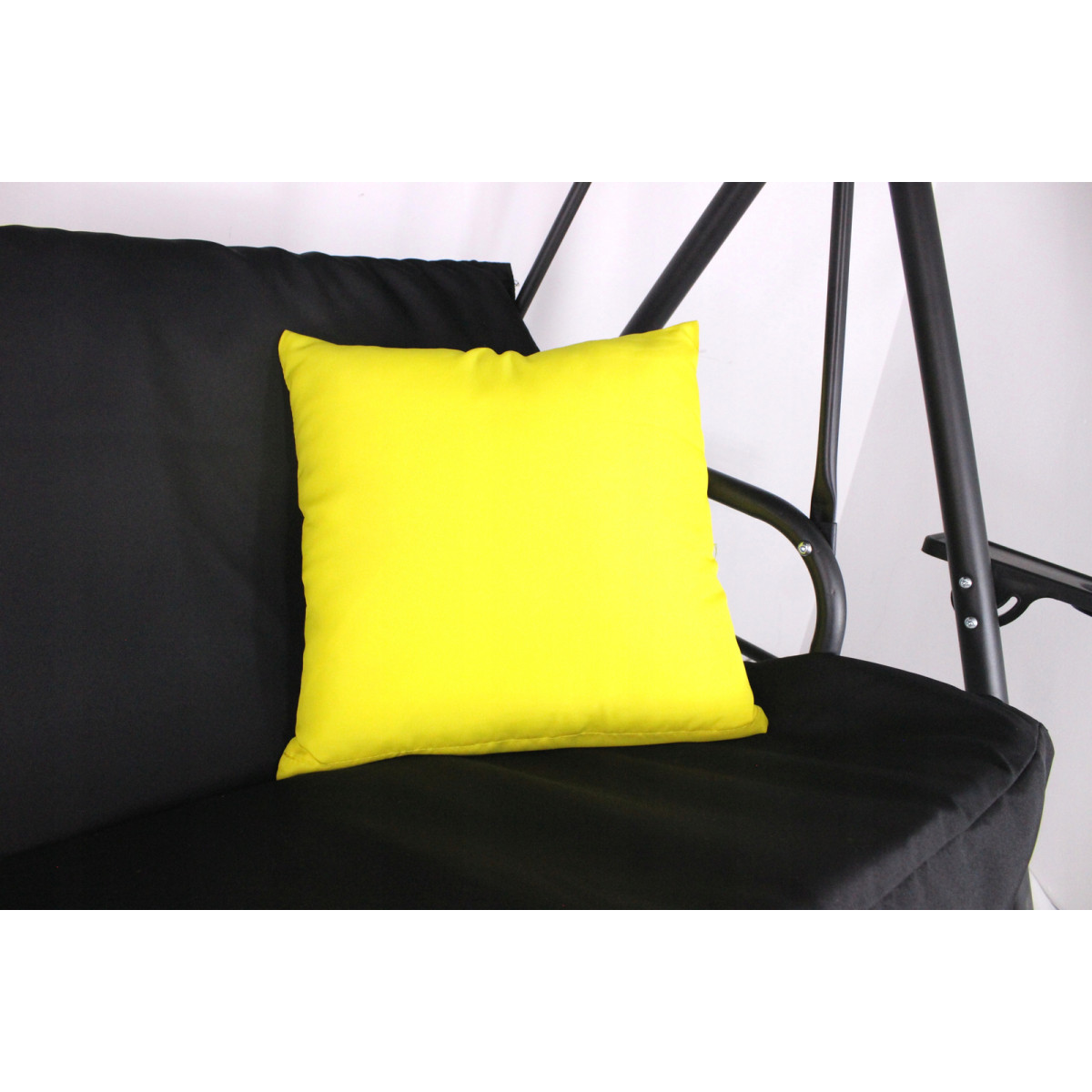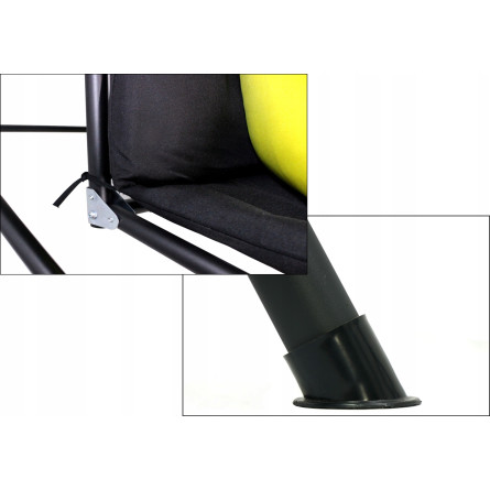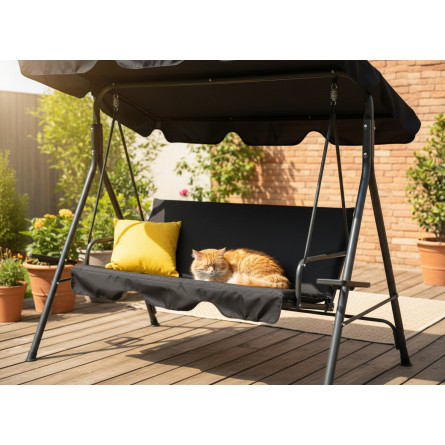 Záhradná hojdačka A-Type spája moderný dizajn s funkčnosťou. Kontrast čiernej konštrukcie a žltých podušiek dodáva priestoru energiu a štýl, čím vytvára príjemnú oddychovú zónu pod holým nebom.