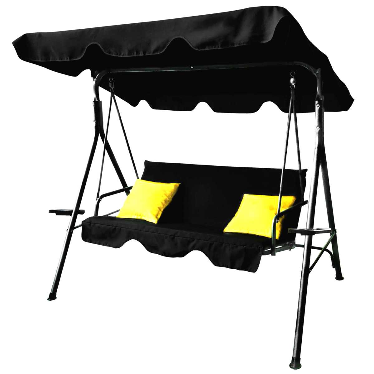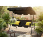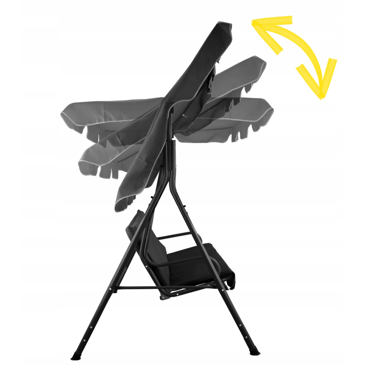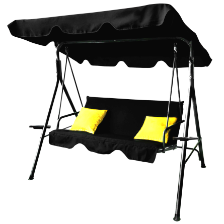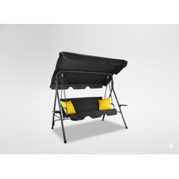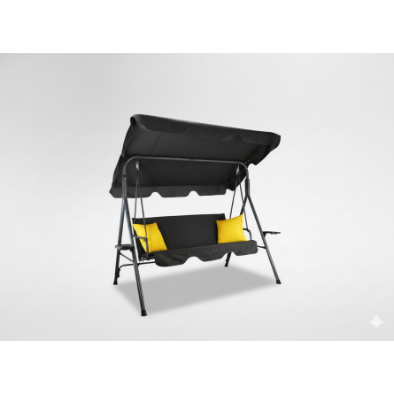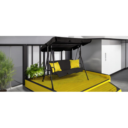 Štýlová záhradná hojdačka A-Type v elegantnej čiernej farbe so žltými poduškami vytvorí ideálne miesto na oddych v záhrade, na terase či balkóne. Stabilná oceľová konštrukcia, nastaviteľná strieška a praktické držiaky na nápoje zabezpečia maximálny komfort pre 2–3 osoby.