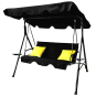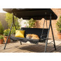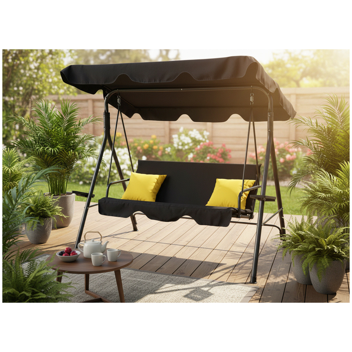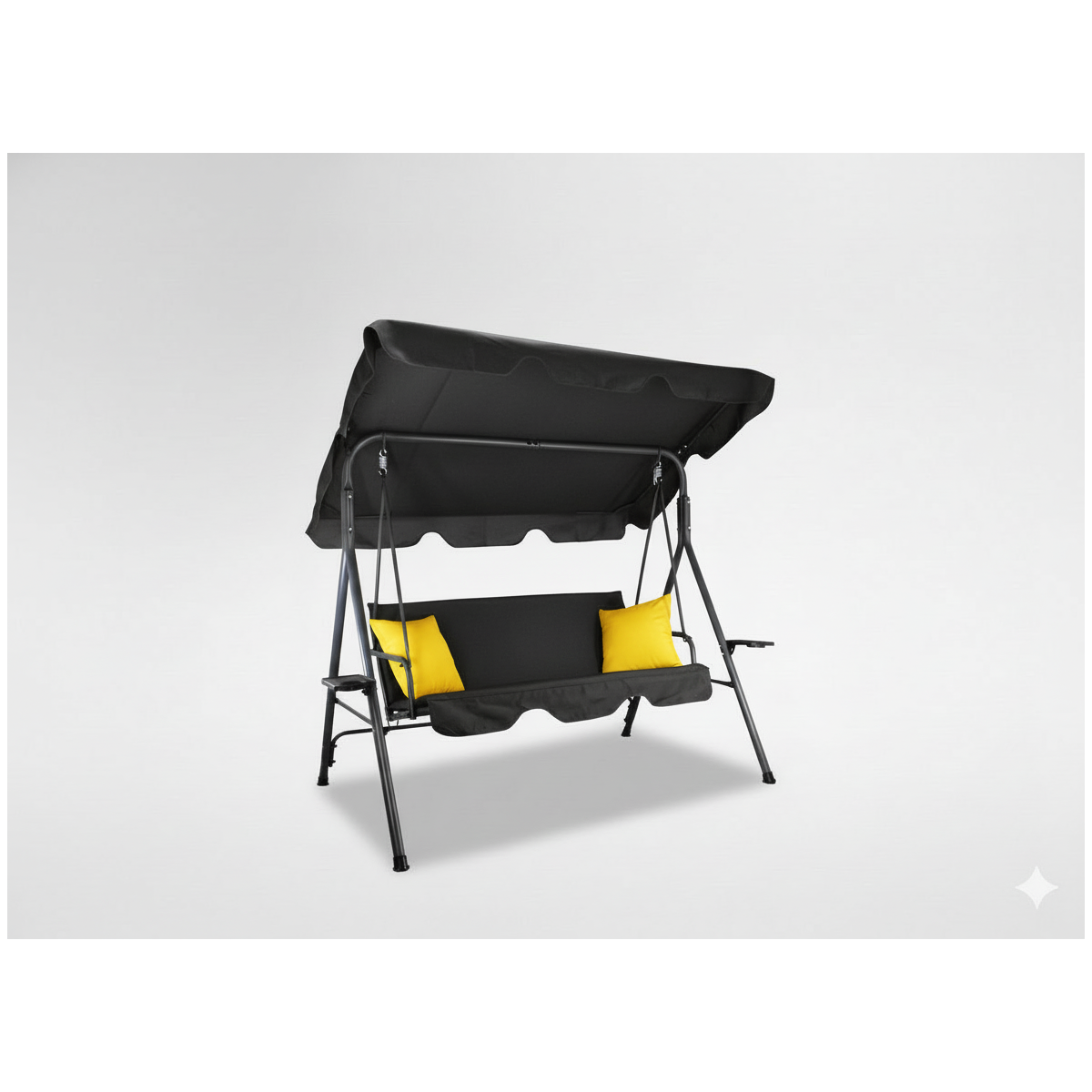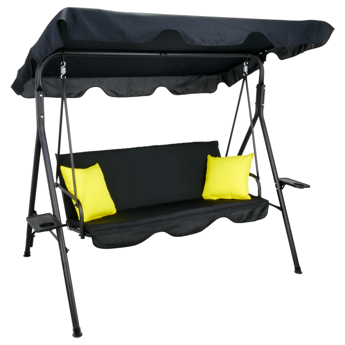 Štýlová záhradná hojdačka A-Type v elegantnej čiernej farbe so žltými poduškami vytvorí ideálne miesto na oddych v záhrade, na terase či balkóne. Stabilná oceľová konštrukcia, nastaviteľná strieška a praktické držiaky na nápoje zabezpečia maximálny komfort pre 2–3 osoby.