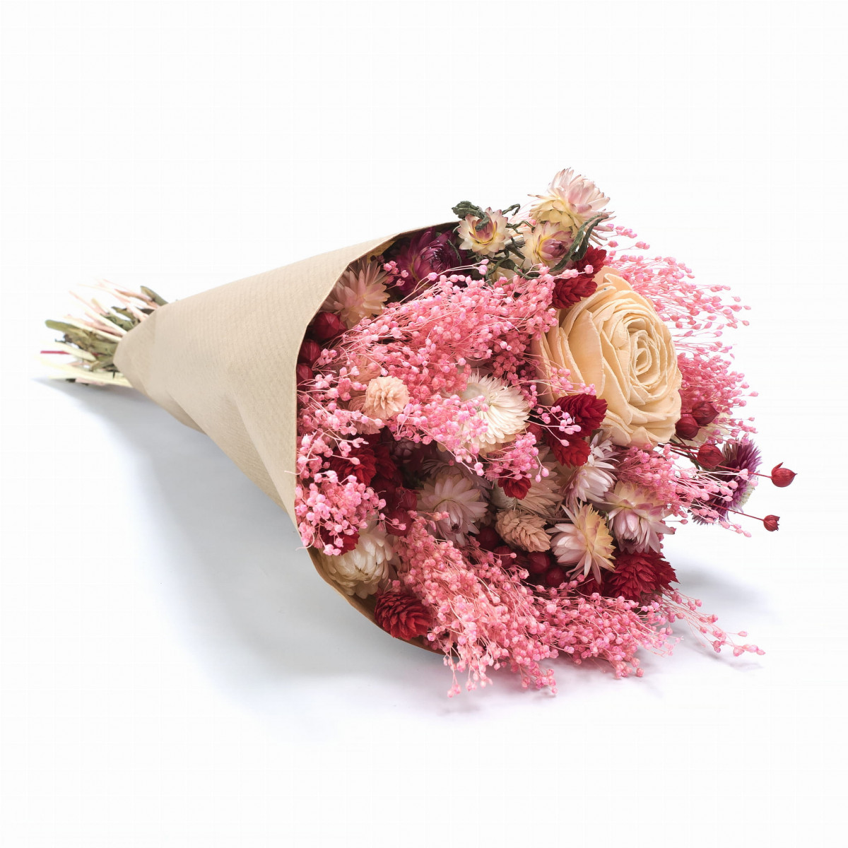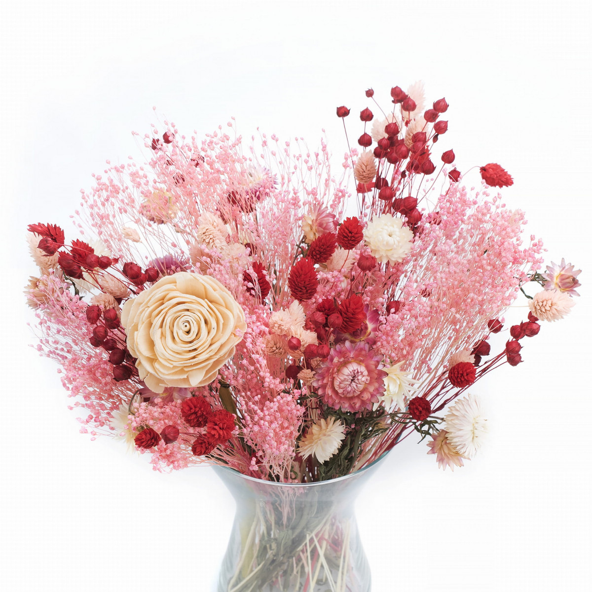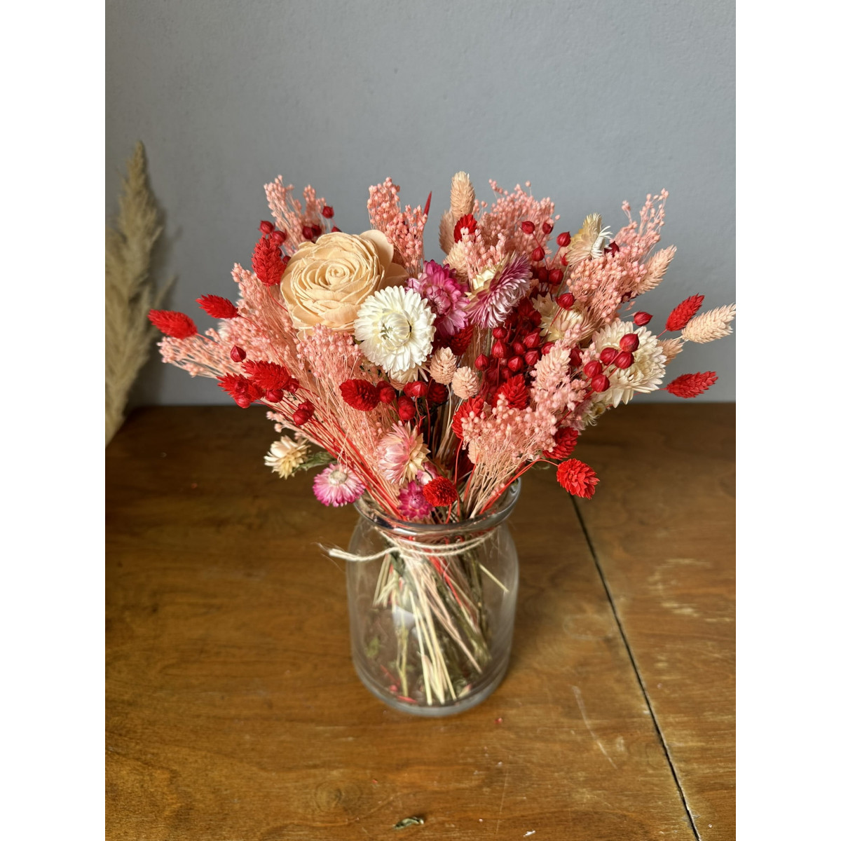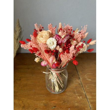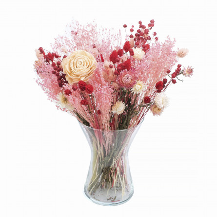 Výrazná kytica v odtieňoch červenej a ružovej, zložená zo starostlivo vybraných sušených rastlín. Je ideálnym darčekom na narodeniny, kolaudáciu či svadbu – zostáva s obdarovaným dlhé mesiace a prináša radosť bez potreby starostlivosti. Sušené kvety tvoria veľkú kyticu, ktorá krásne oživí interiér bytu, hotela či reštaurácie. A čo je najlepšie – žiadna voda, žiadna údržba.