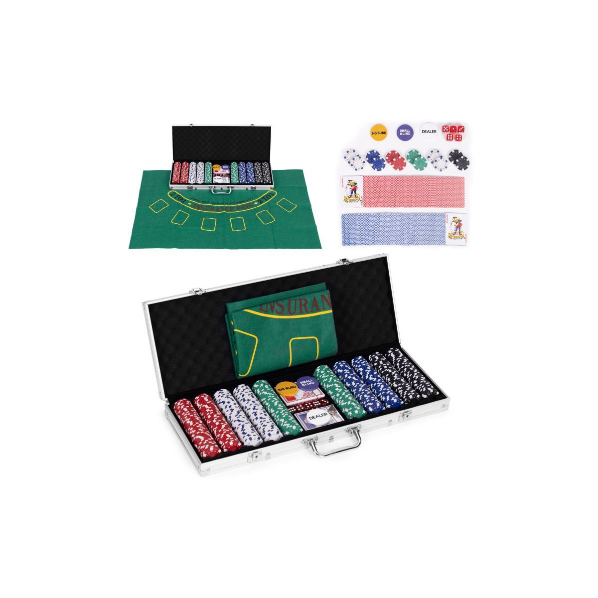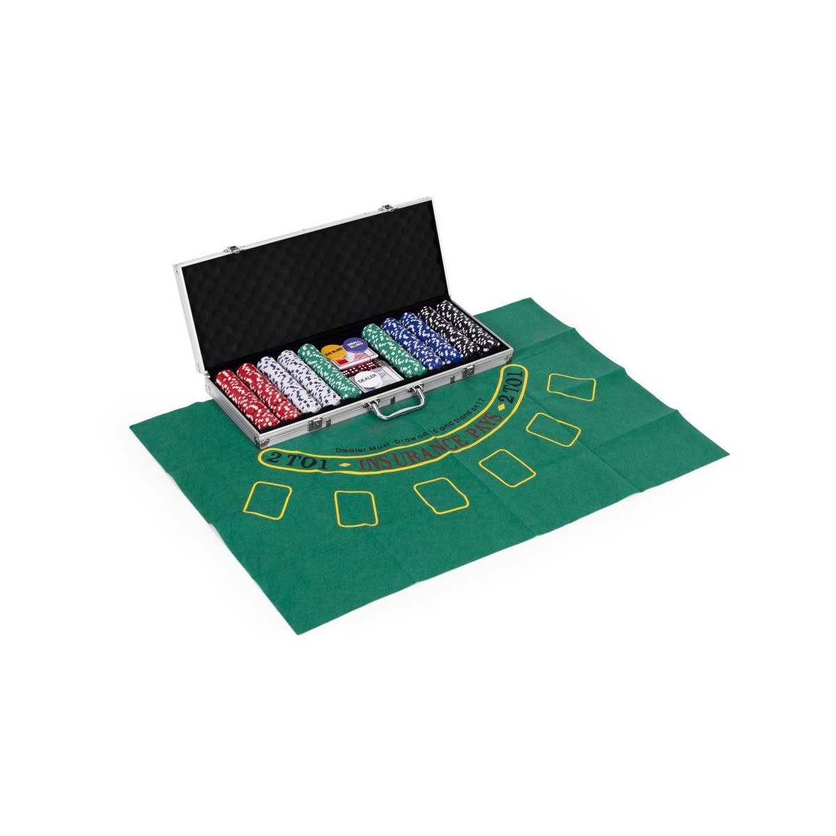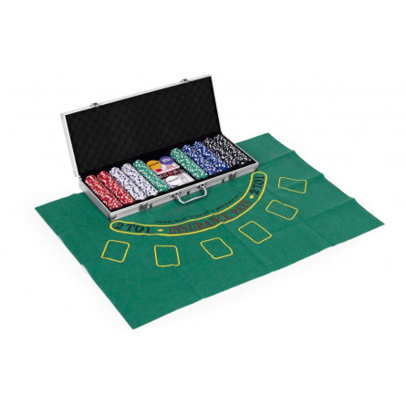 Zábava ako v kasíne – priamo u vás doma! Táto elegantná sada na poker a blackjack je ideálnou voľbou pre všetkých milovníkov kartových hier. Obsahuje všetko, čo potrebujete na napínavé herné večery – 500 žetónov v 5 farbách, 2 balíčky kariet, 5 kociek, materiálovú podložku na blackjack a uzamykateľný kufrík, ktorý uľahčuje prenášanie aj skladovanie. Vhodné až pre 8 hráčov, a to ako pre začiatočníkov, tak aj pokročilých.