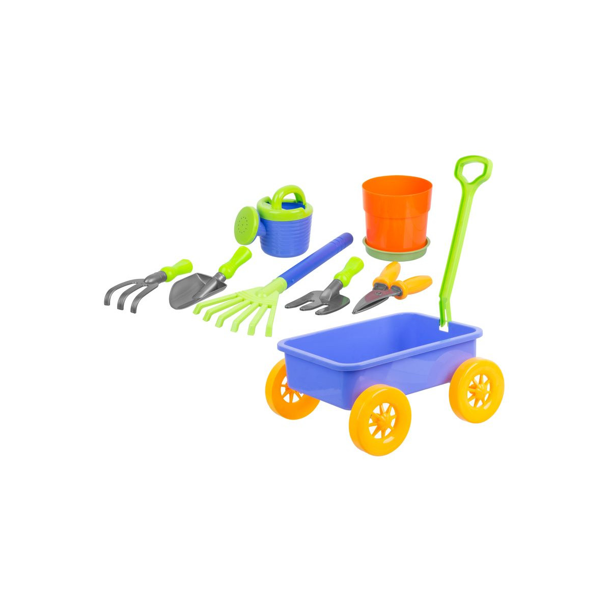 - Obsah balenia: vozík, polievačka, kvetináč s podložkou, hrabličky (2x), lopatka, vidličky (2x), nožnice