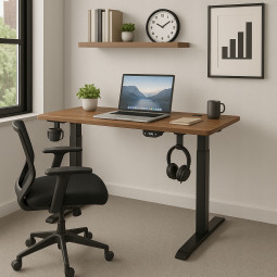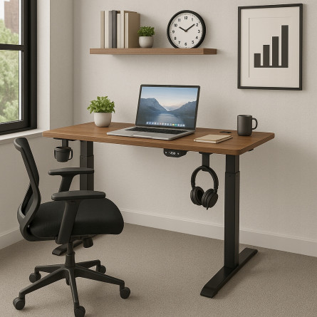 Tento elektricky výškovo nastaviteľný stôl je ideálny pre moderné pracoviská. Výška stola je plynule nastaviteľná, ovládanie je jednoduché pomocou LED panela. Stolová doska s hrúbkou 18 mm poskytuje pevnú povrchovú plochu, podporná konštrukcia z ocele zabezpečuje stabilitu. Vďaka zabudovaným LED prvkom, prietokovým káblovým priechodkám, držiaku na slúchadlá a pevnej konštrukcii je ideálny pre prácu či hranie v domácnosti.