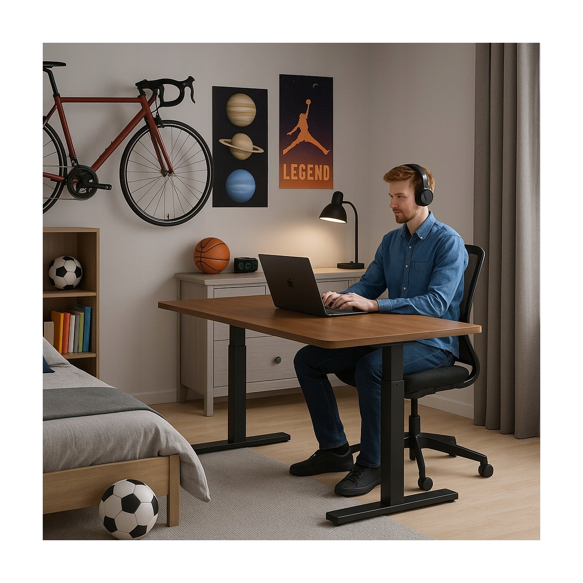 Tento elektricky výškovo nastaviteľný stôl je ideálny pre moderné pracoviská. Výška stola je plynule nastaviteľná, ovládanie je jednoduché pomocou LED panela. Stolová doska s hrúbkou 18 mm poskytuje pevnú povrchovú plochu, podporná konštrukcia z ocele zabezpečuje stabilitu. Vďaka zabudovaným LED prvkom, prietokovým káblovým priechodkám, držiaku na slúchadlá a pevnej konštrukcii je ideálny pre prácu či hranie v domácnosti.