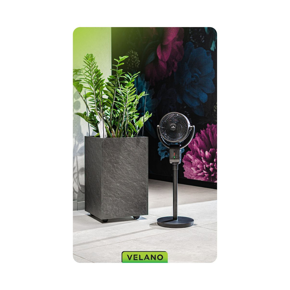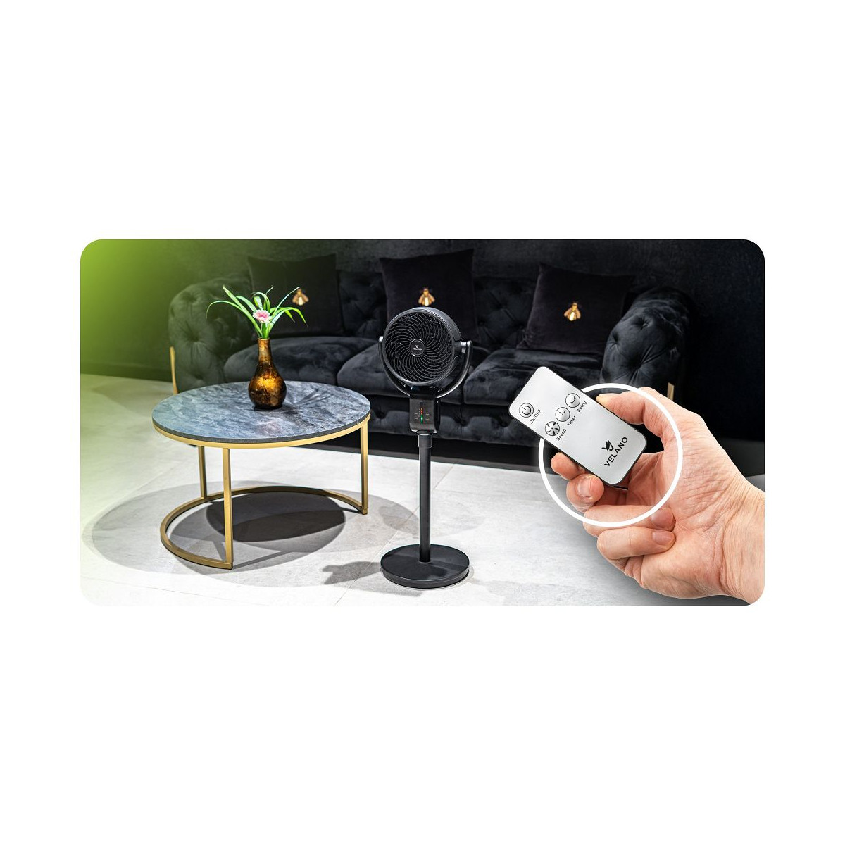 Podlahový ventilátor Velano s tichou prevádzkou, 3 režimami, osciláciou, nastaviteľným sklonom hlavice a diaľkovým ovládaním. Výkonný, bezpečný a praktický.