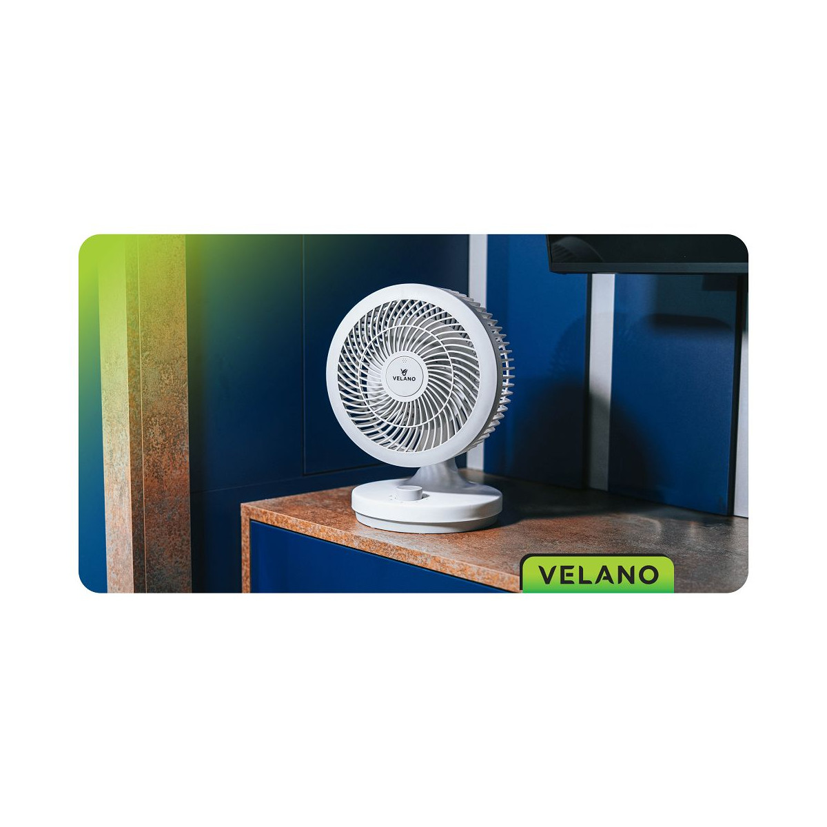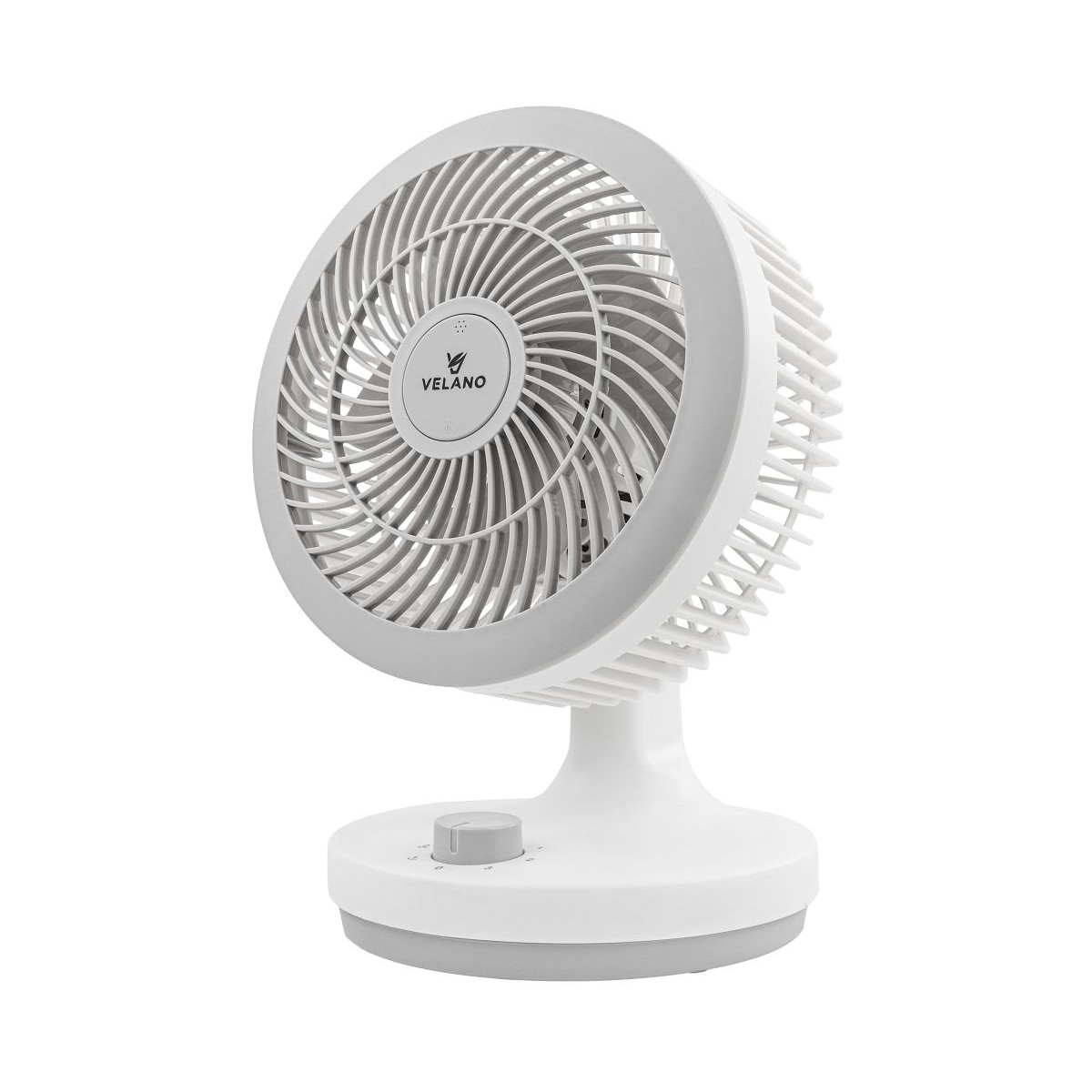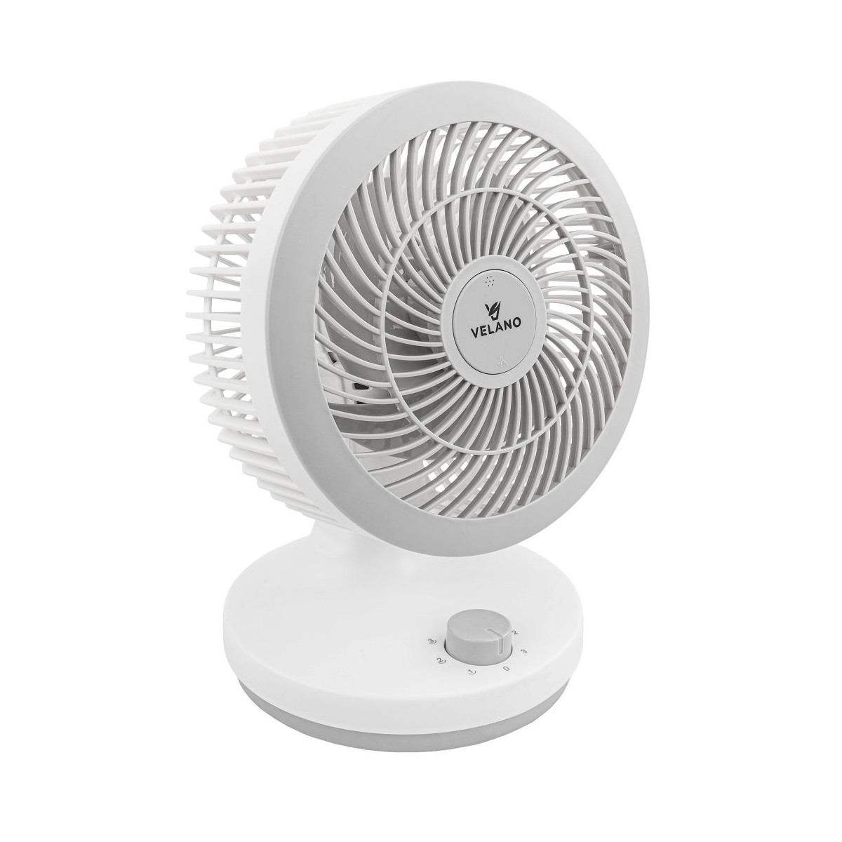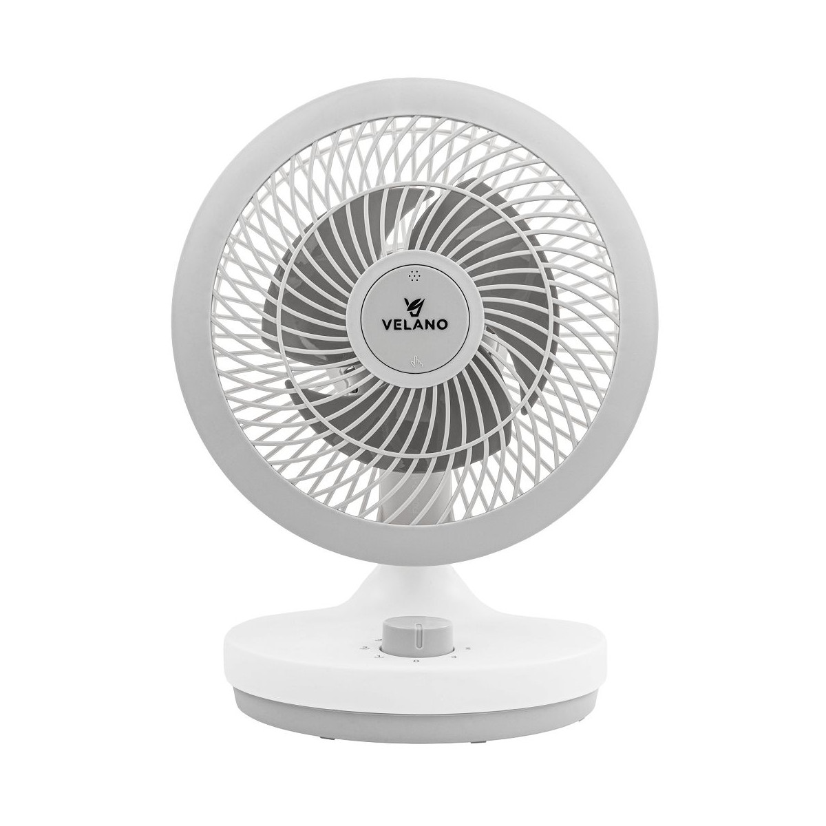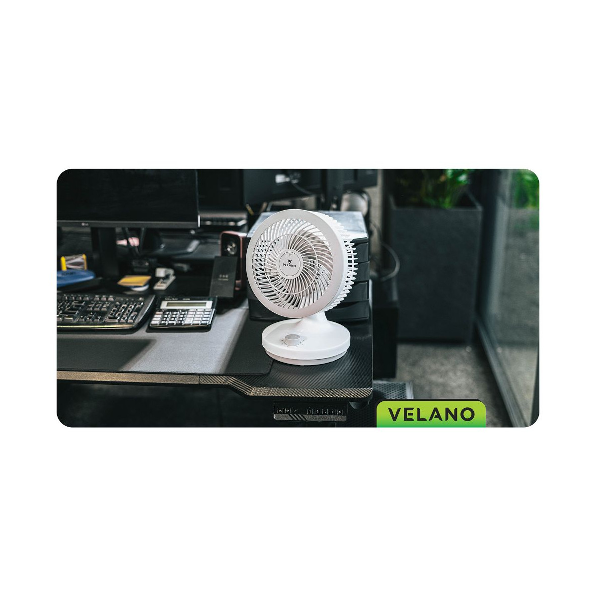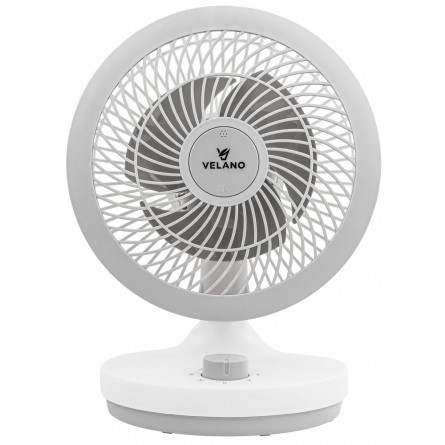 Stolový ventilátor Velano s výkonom 50 W, 3 rýchlosťami, osciláciou a aromaterapiou. Tichý chod, nastaviteľný sklon a stabilná konštrukcia pre maximálne pohodlie.