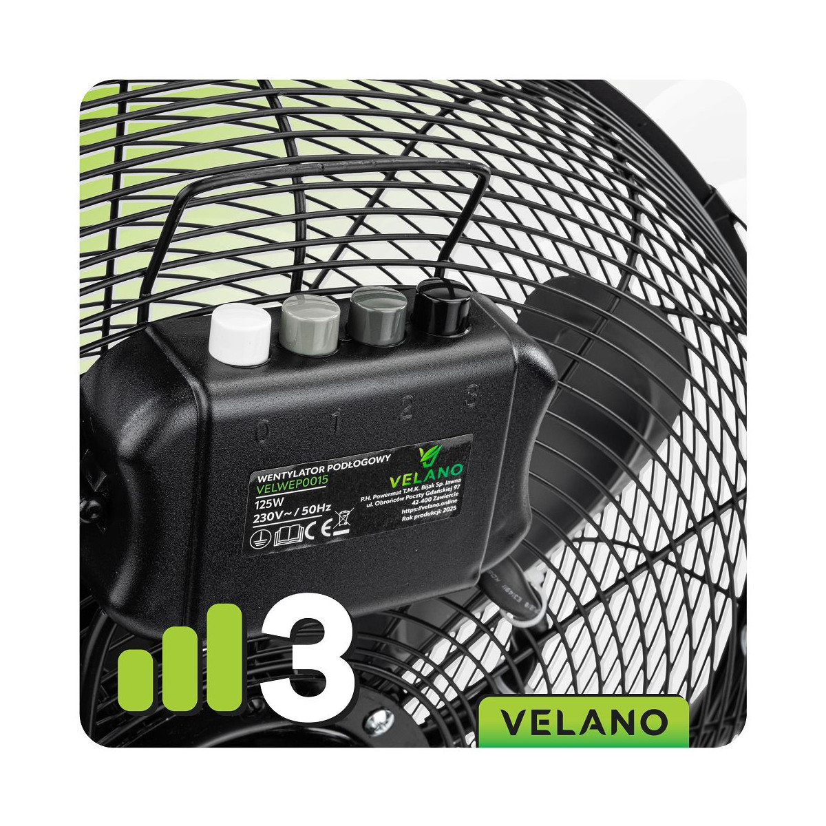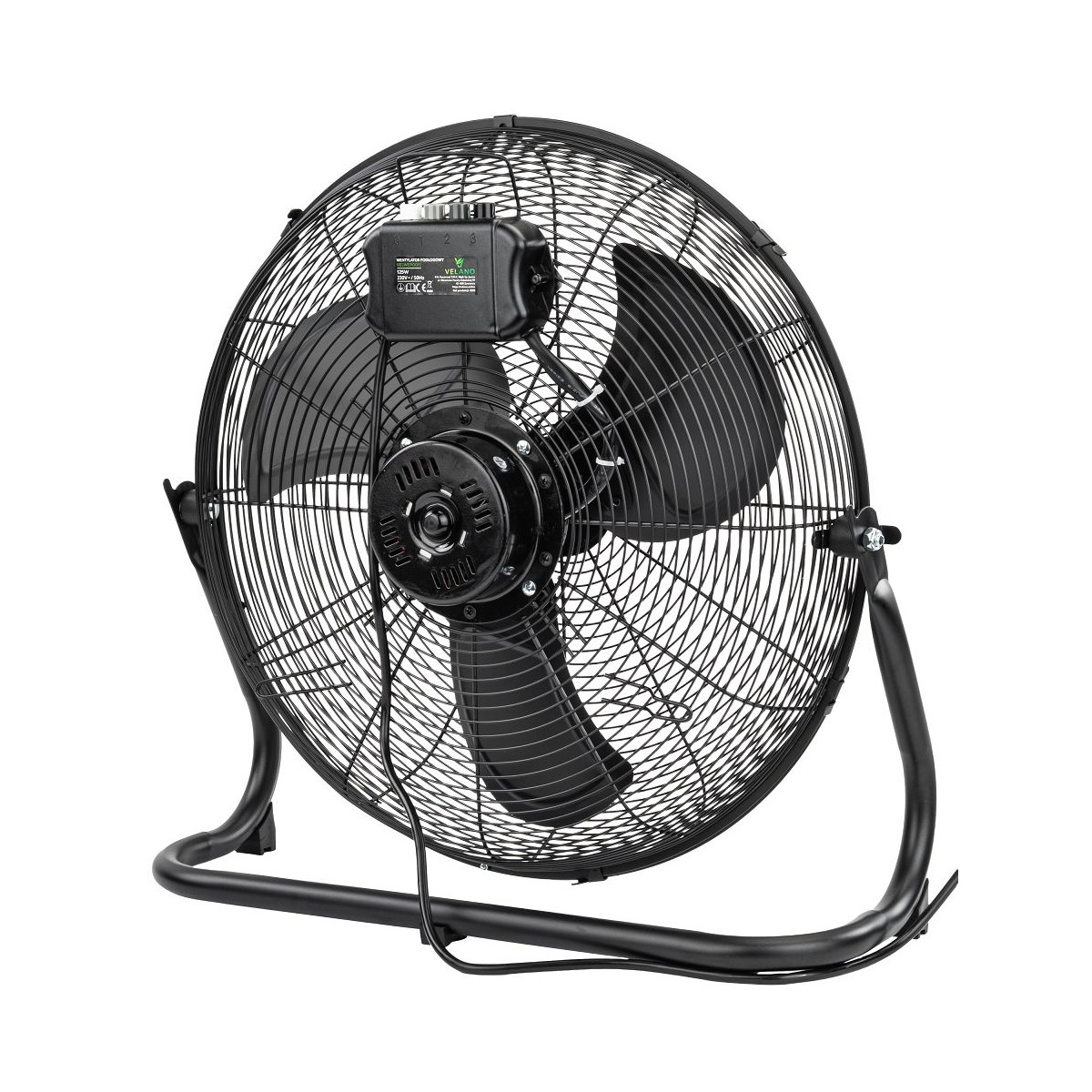 Výkonný priemyselný ventilátor Velano s 125 W motorom, 50 cm priemerom, nastaviteľným sklonom a 3 rýchlosťami. Stabilný, tichý a vhodný aj do väčších priestorov.