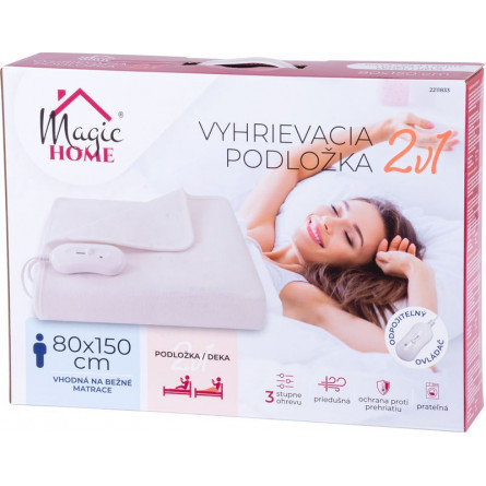 Vyhrievacia podložka 2v1 MagicHome spríjemní Vaše chvíle relaxu a ponúka Vám potešenie z prispôsobeného tepla, ktoré Vás zahalí do príjemného objatia kedykoľvek si budete priať. Podložka je vyrobená z mäkkej netkanej textílie, ktorá je ľahká, priedušná, príjemná na dotyk a zároveň dostatočne teplá na udržanie telesnej teploty. Využitie 2v1: ako podložka aj ako deka. Odporúča sa pri liečbe reumatických ochorení a artritídy. Uvoľňuje svaly a zlepšuje cirkuláciu krvi. Ovládanie teploty pomocou ovládača na napájacom kábli ( 3 stupne ohrevu: 25°C - 50°C). Vďaka odpojiteľnému ovládaču je podložku možné prať v práčke. Farba: biela. Rozmery: 80x150 cm, je vhodná pre bežné matrace.