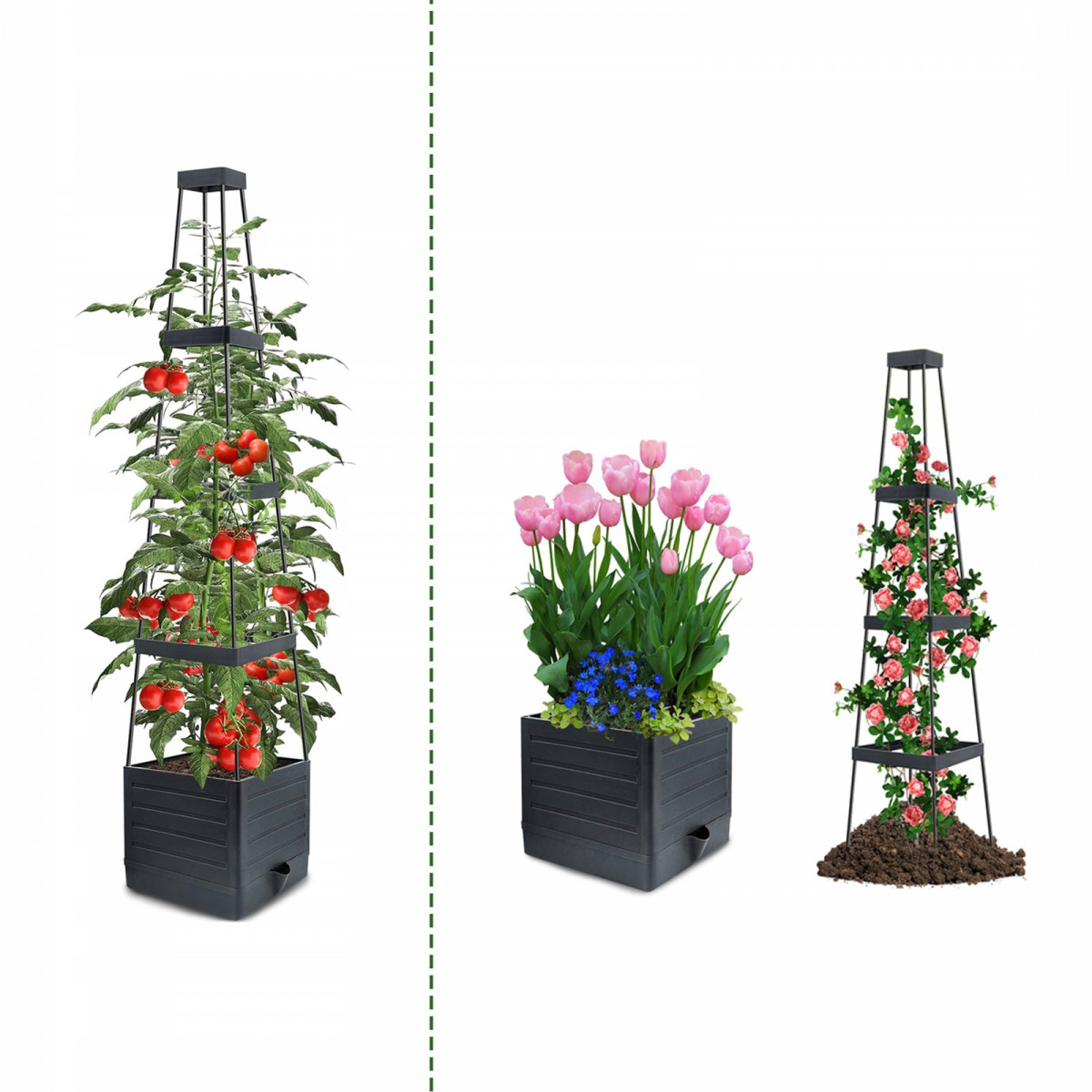 Špeciálny otvor na zalievanie, umiestnený na dne črepníka, umožňuje presné a efektívne zavlažovanie. Vďaka tomu voda prichádza priamo ku koreňom, eliminujúc riziko preliatia a chorôb rastlín. Toto je riešenie, ktoré šetrí čas a zaručuje zdravý rast rastlín! - Tento všestranný črepník nie je len vynikajúcou voľbou pre milovníkov pestovania paradajok, uhorky alebo inej zeleniny. Vďaka svojej jedinečnej konštrukcii môže tiež plniť funkciu ozdobného črepníka na kvety, ako sú tulipány, ruže alebo popínavé rastliny. Je to skutočné riešenie 2v1, ktoré umožňuje ľubovoľné využitie v závislosti od vašich potrieb. Mení aranžmán vášho balkónu alebo terasy podľa sezóny a užívajte si krásu rastlín po celý rok!