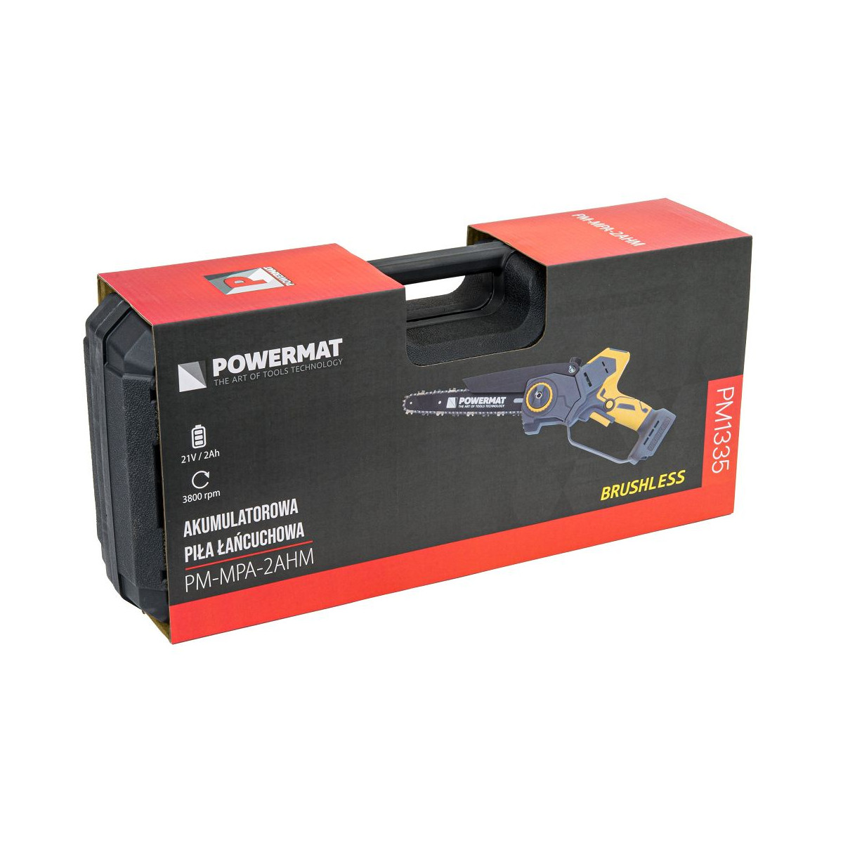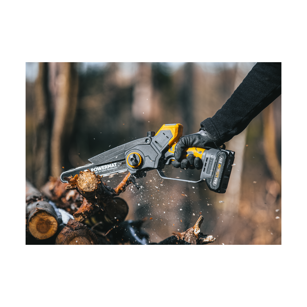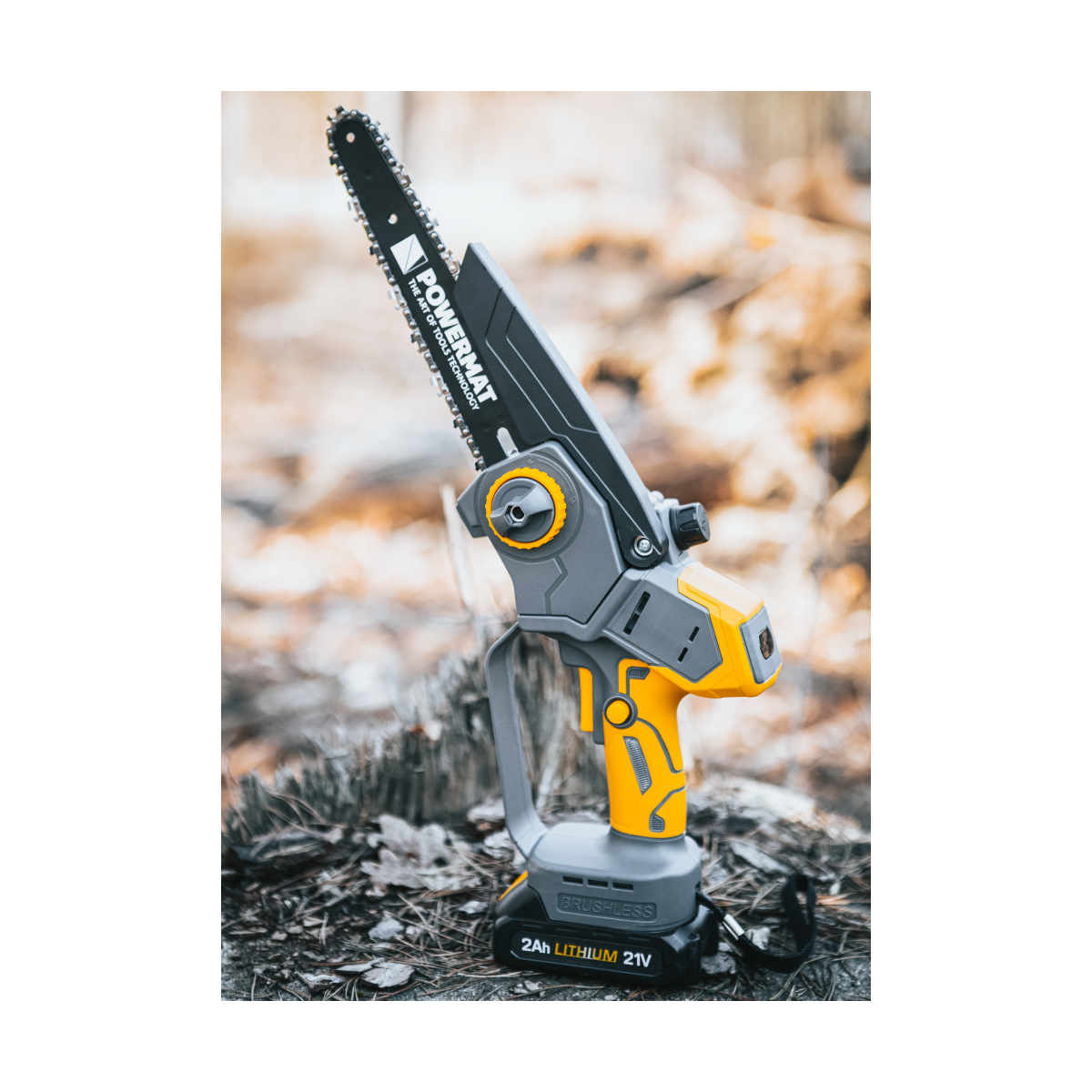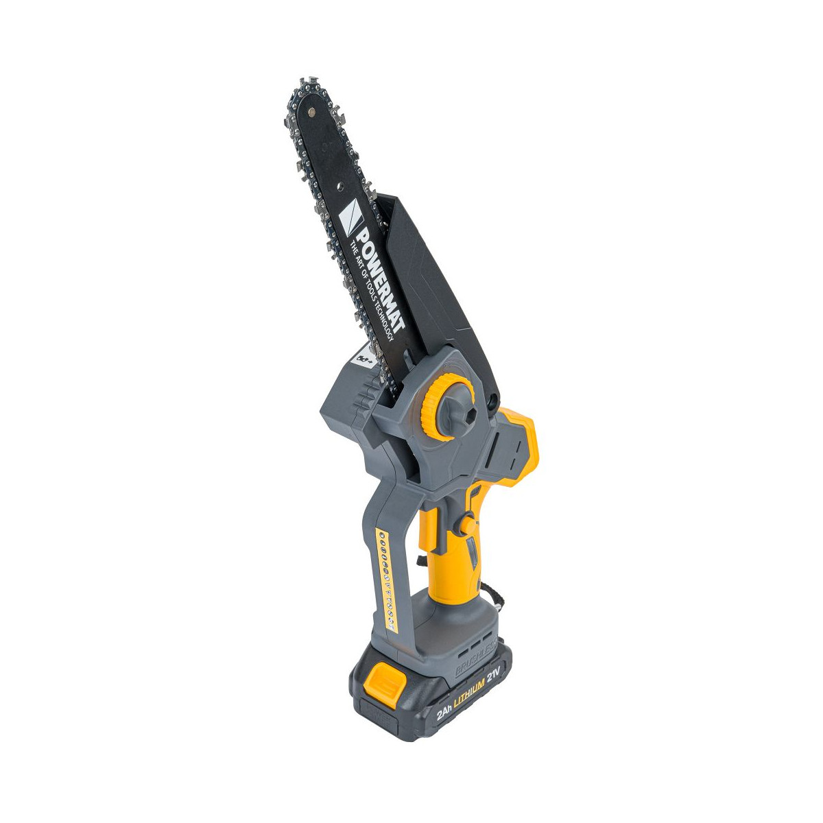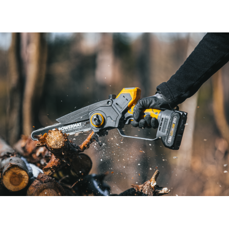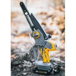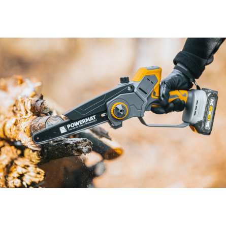 Ľahká akumulátorová píla Powermat PM-MPA-2AHM s 2× 21V batériou, bezuhlíkovým motorom a LCD ukazovateľom nabitia. Ideálna na záhradu a prípravu dreva.
