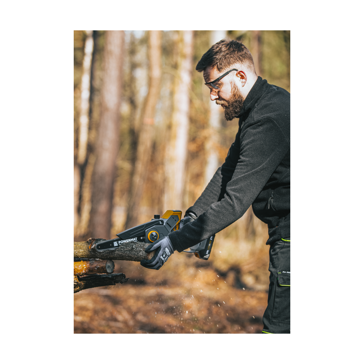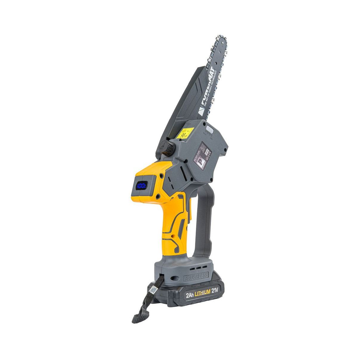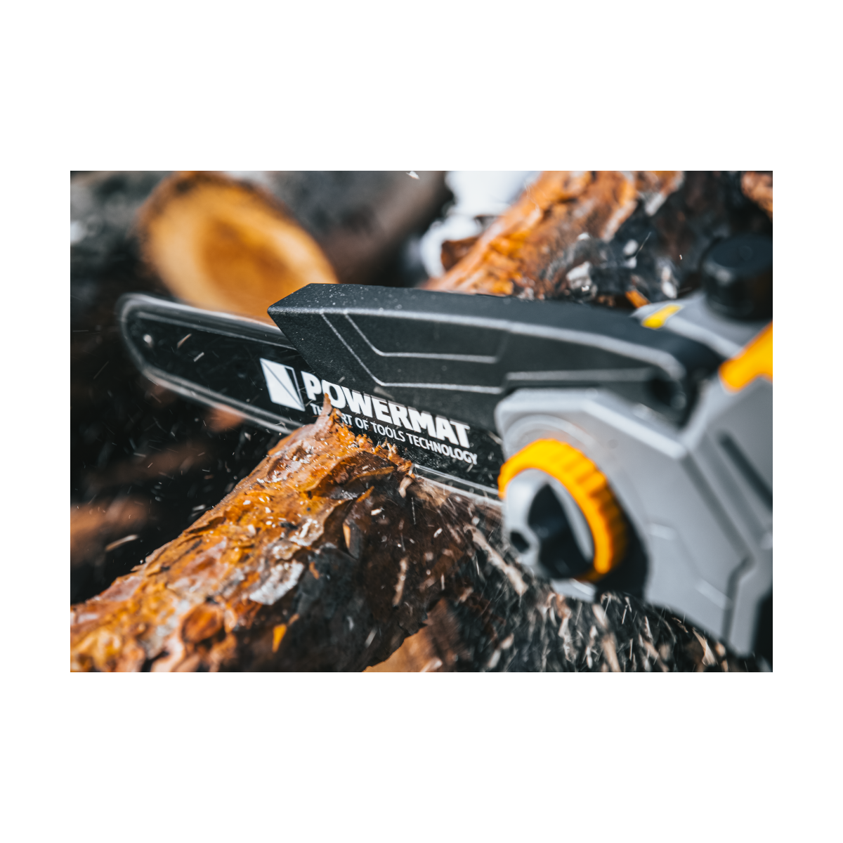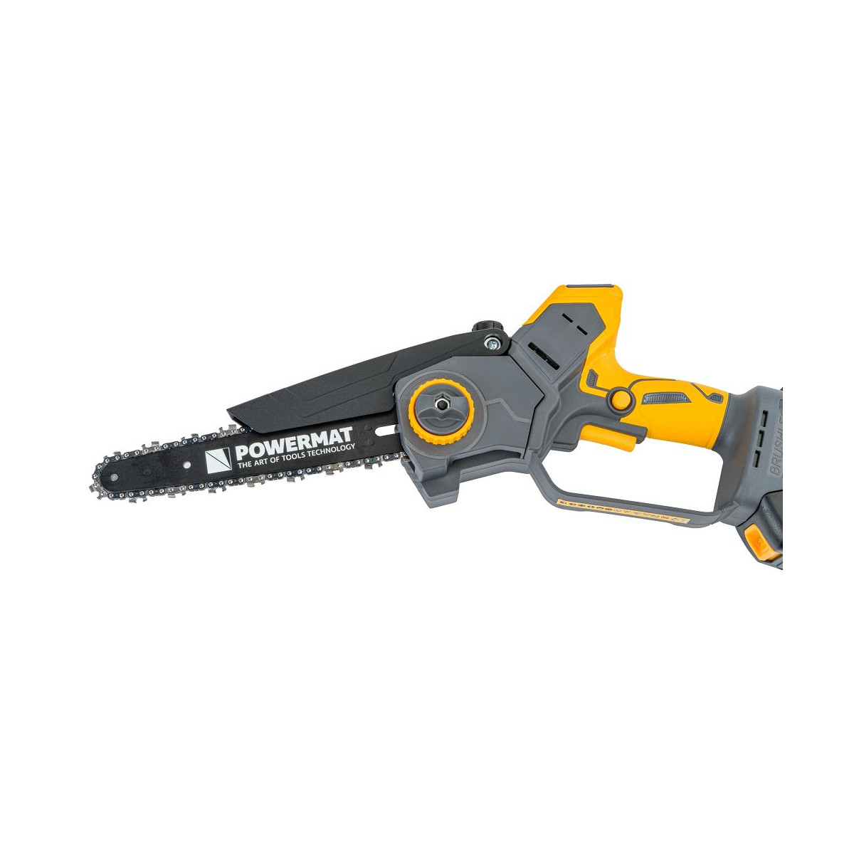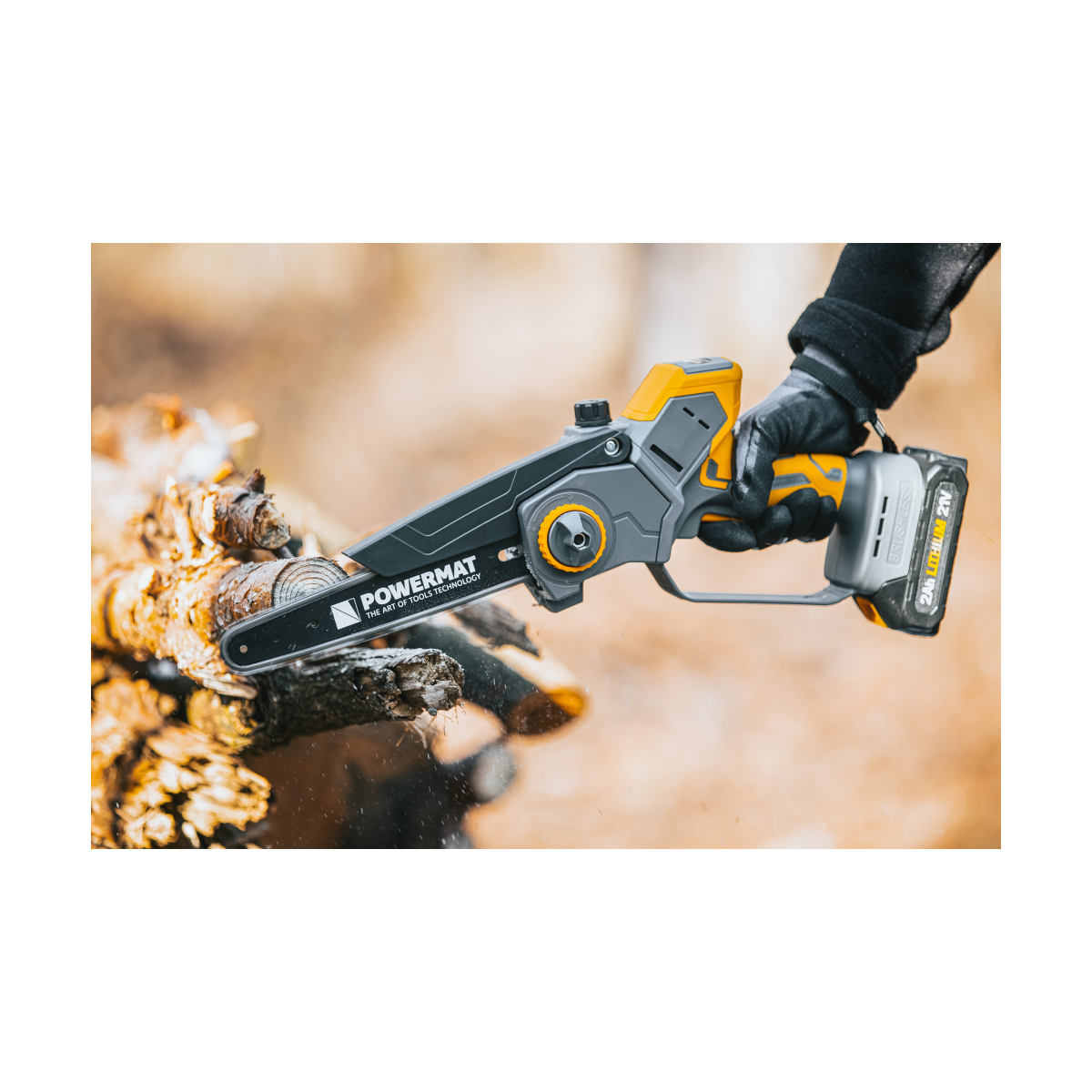 Ľahká akumulátorová píla Powermat PM-MPA-2AHM s 2× 21V batériou, bezuhlíkovým motorom a LCD ukazovateľom nabitia. Ideálna na záhradu a prípravu dreva.