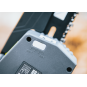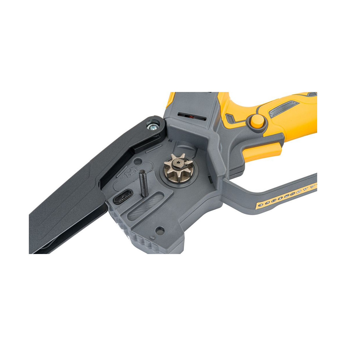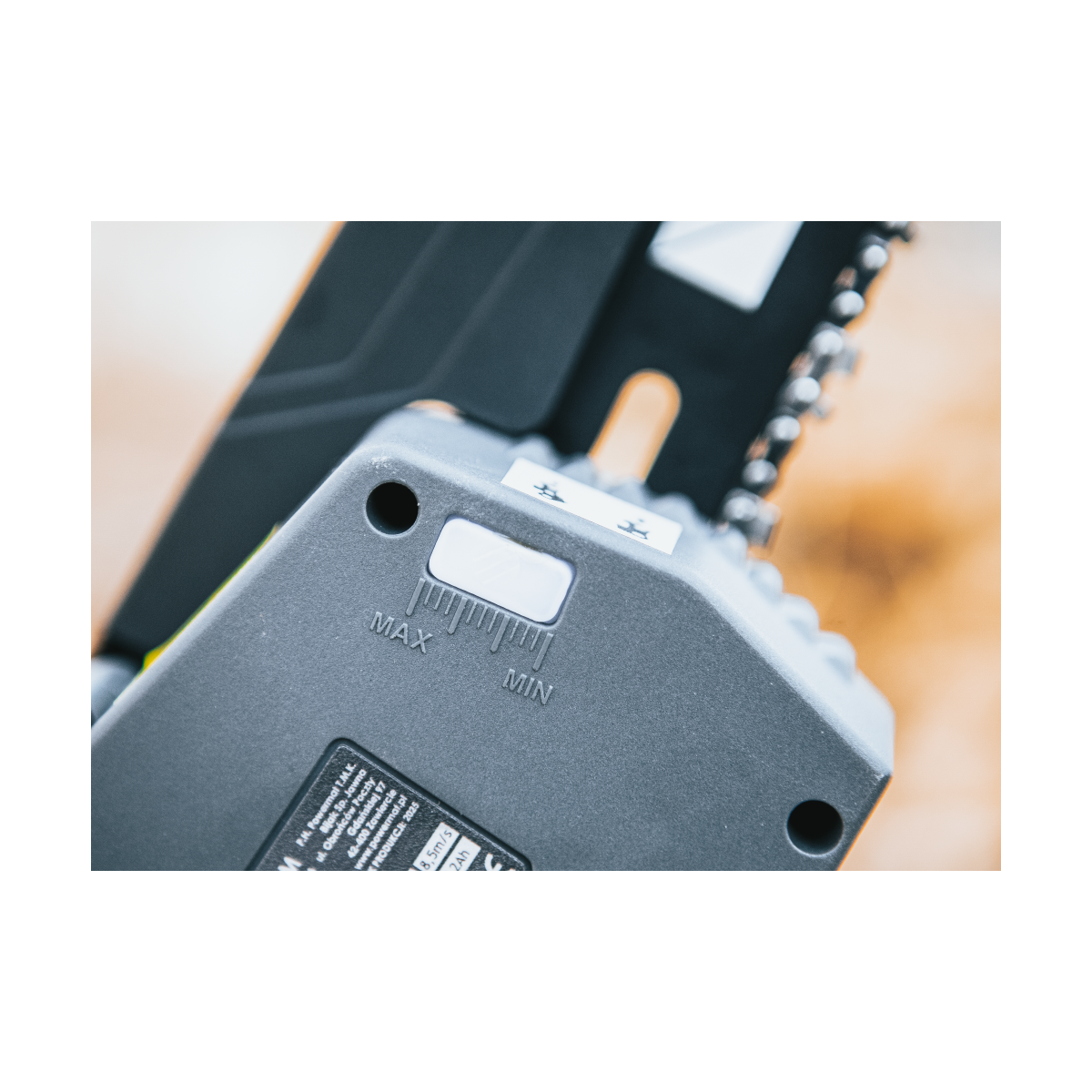 Reťazová ochrana chráni pred odletujúcimi trieskami, rukoväť chráni dlaň. Spúšť je vybavená poistkou proti nechcenému zapnutiu.