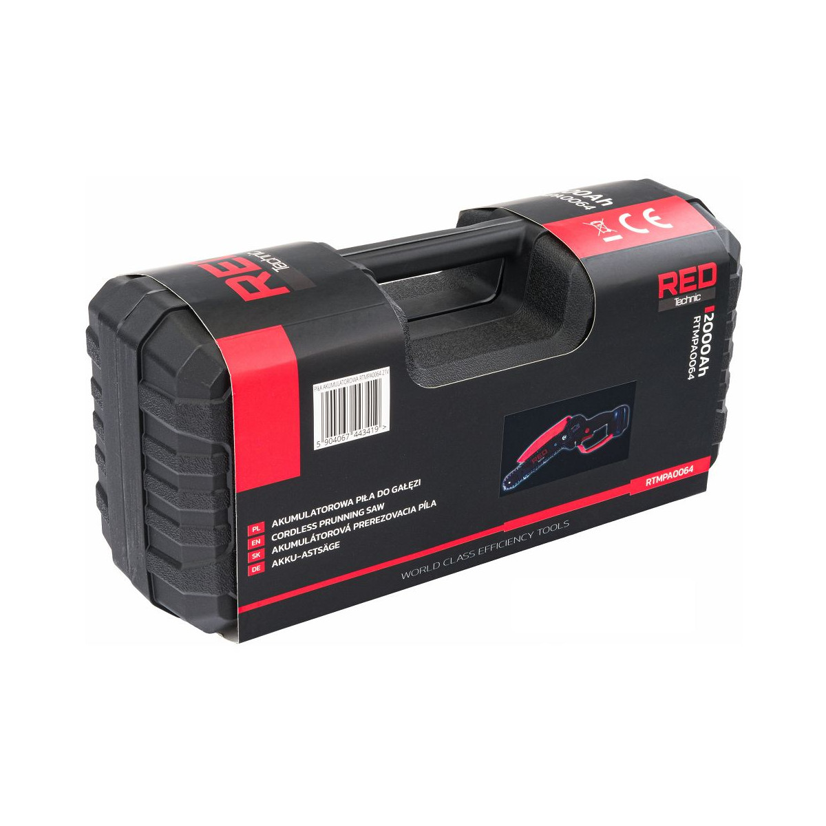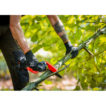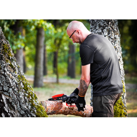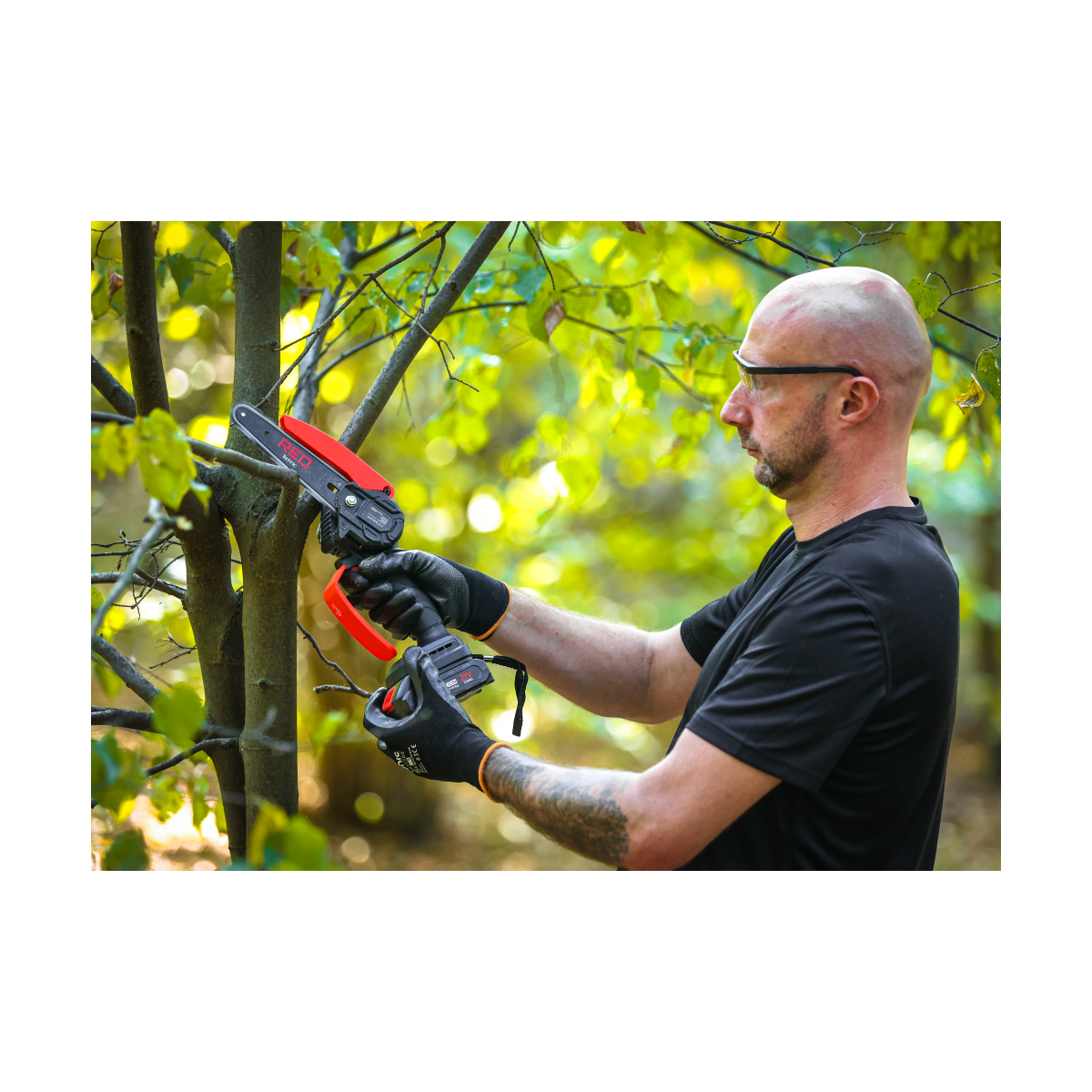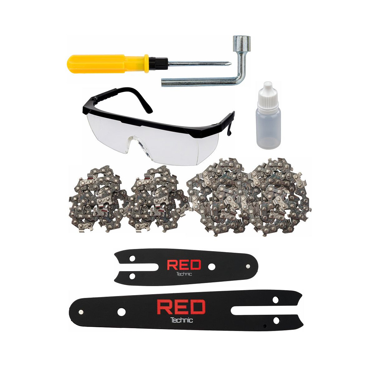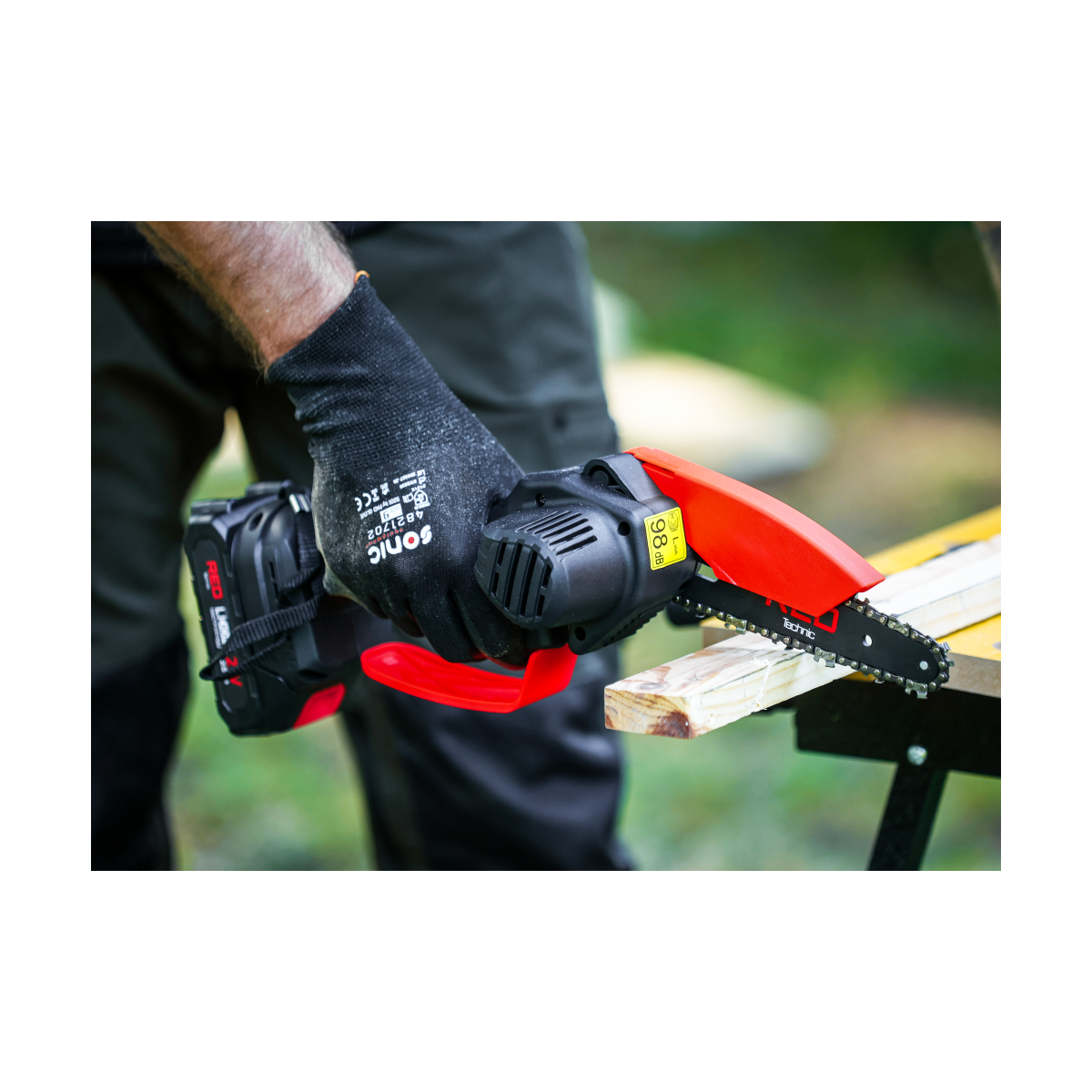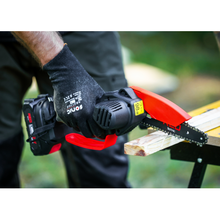 Ľahká akumulátorová píla Red Technic RTMPA0064 s 2× 20V batériou, 4 reťazami a lištami 4" + 6". Ideálna na konáre, malé stromčeky a palivové drevo.