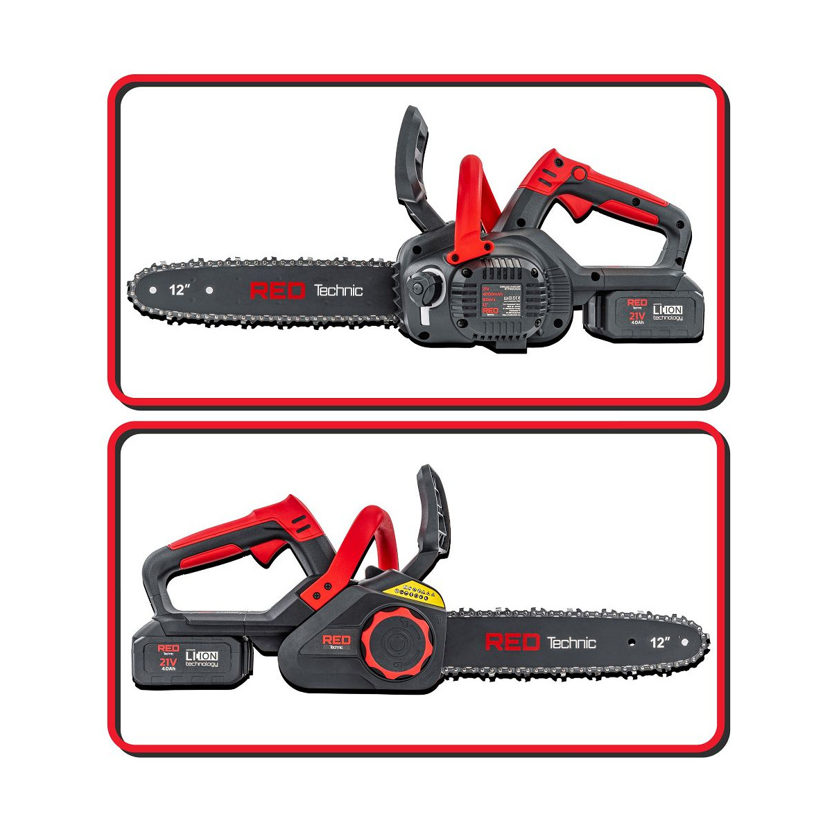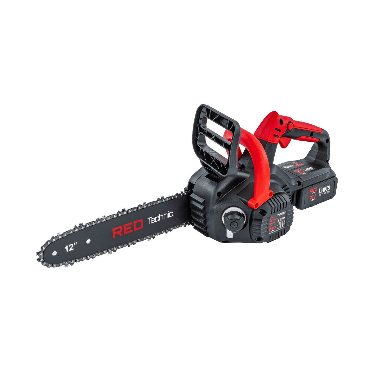 Výkonná akumulátorová píla RTPAK0124 s lištou 12", dvomi batériami 21V/4000 mAh a bezpečnostnou brzdou. Ideálna na konáre, stromy a palivové drevo.