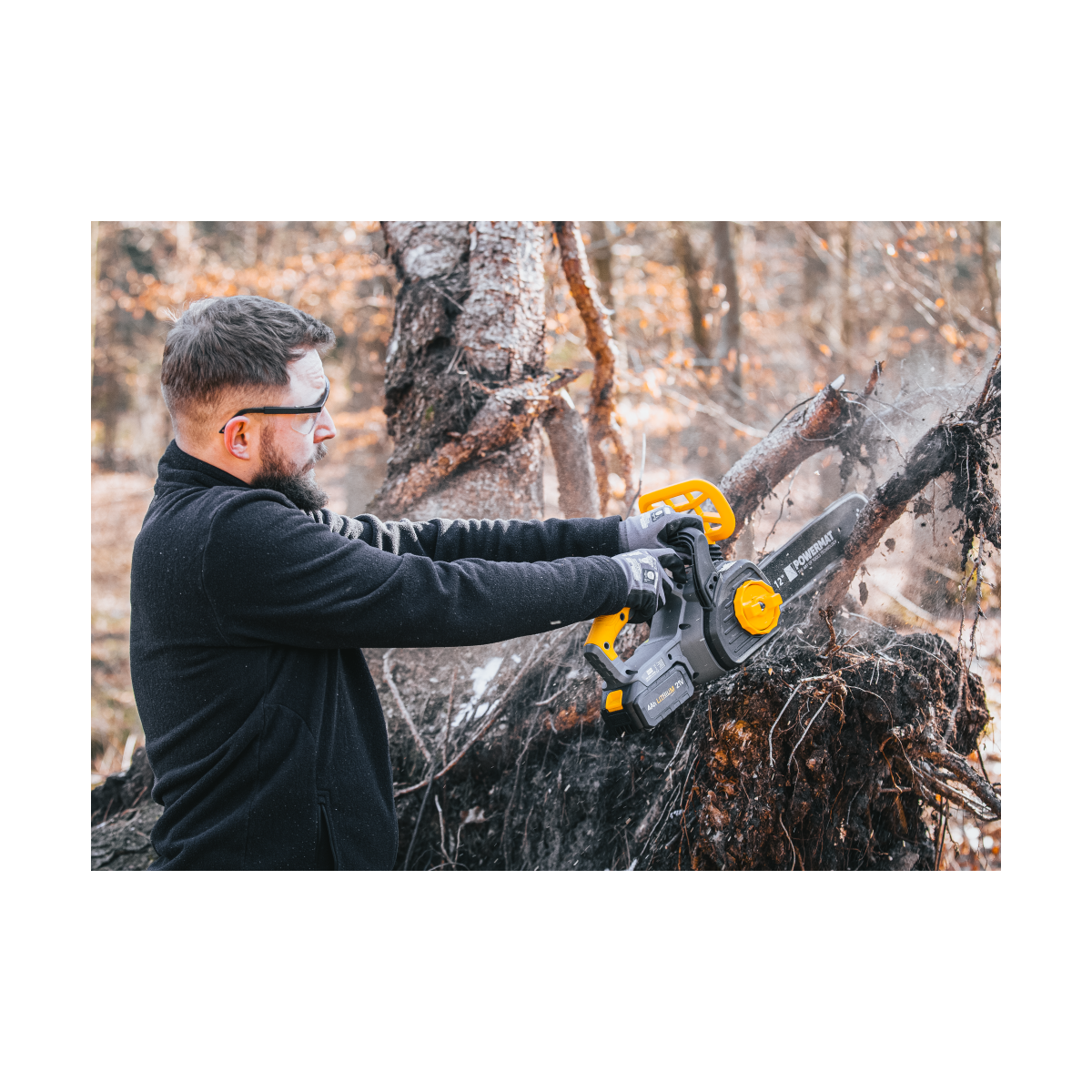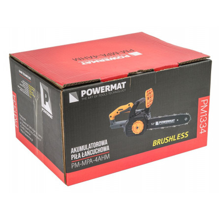Výkonná akumulátorová píla Powermat PM-MPA-4AHM s lištou 12", 2× 4Ah batériami a bezuhlíkovým motorom. LCD displej a bezpečnostná brzda pre maximálnu kontrolu.