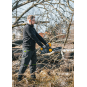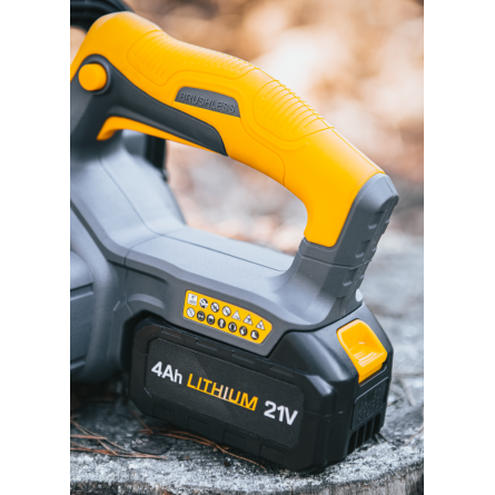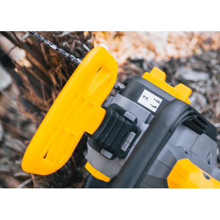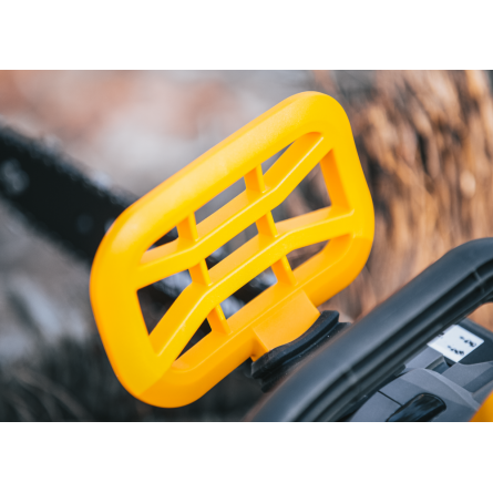 Bezpečnosť je garantovaná reťazovou brzdou, blokáciou spúšte a tepelnou ochranou motora. Praktické funkcie dopĺňa LCD ukazovateľ stavu batérie a pohodlné napínanie reťaze s blokovacou maticou.