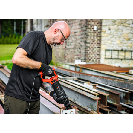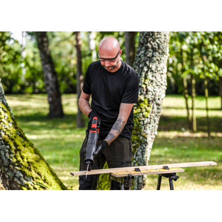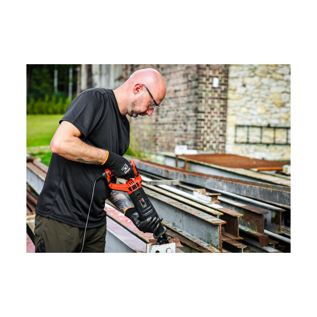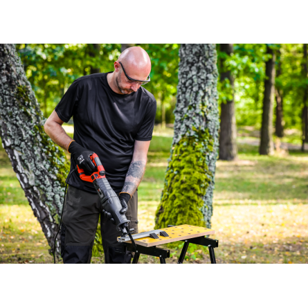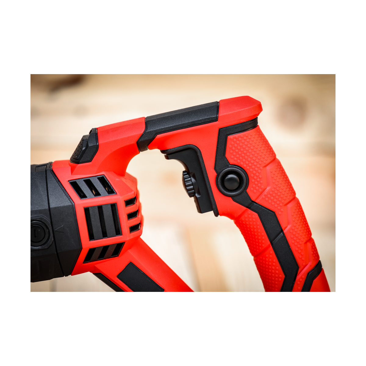 Vďaka pätke nastaviteľnej v 5 stupňoch je možné prispôsobiť uhol rezu pre presné výsledky. Systém SDS umožňuje rýchlu a jednoduchú výmenu pílového plátku bez náradia. Ergonomická rukoväť s protišmykovým povrchom a možnosť otáčania o 45° a 90° zvyšuje komfort pri používaní.