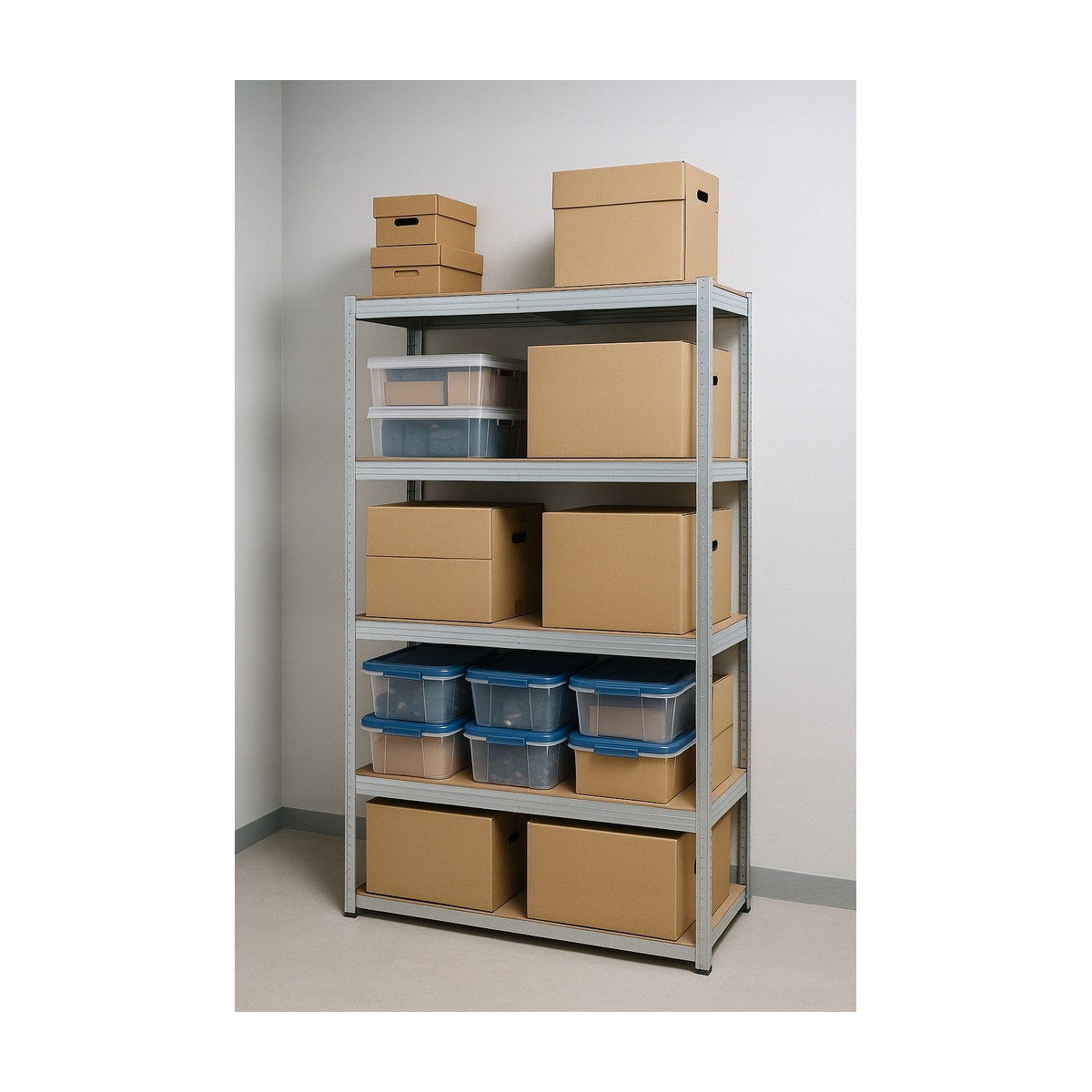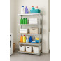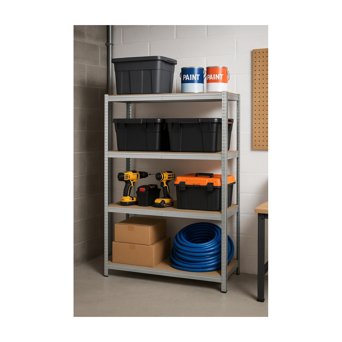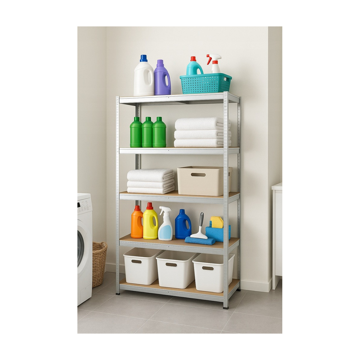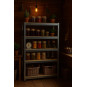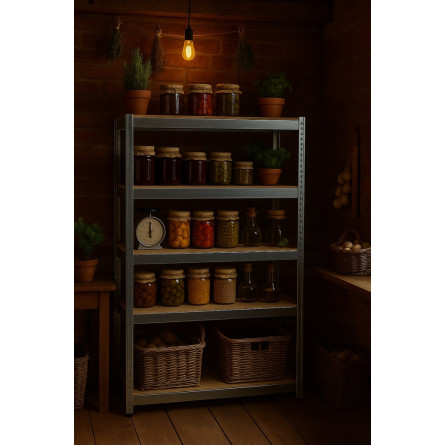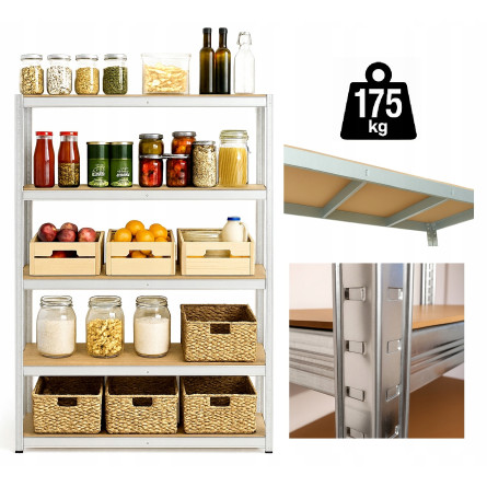 Veľký kovový regál s 5 MDF policami a celkovou nosnosťou až 875 kg. Zosilnená pozinkovaná konštrukcia s dvojitými stredovými výstuhami, nastaviteľná výška políc, bezskrutkový montážny systém a možnosť rozdelenia na dva samostatné moduly. Ideálny do garáže, dielne, pivnice alebo skladu.