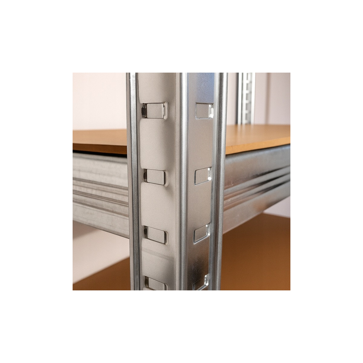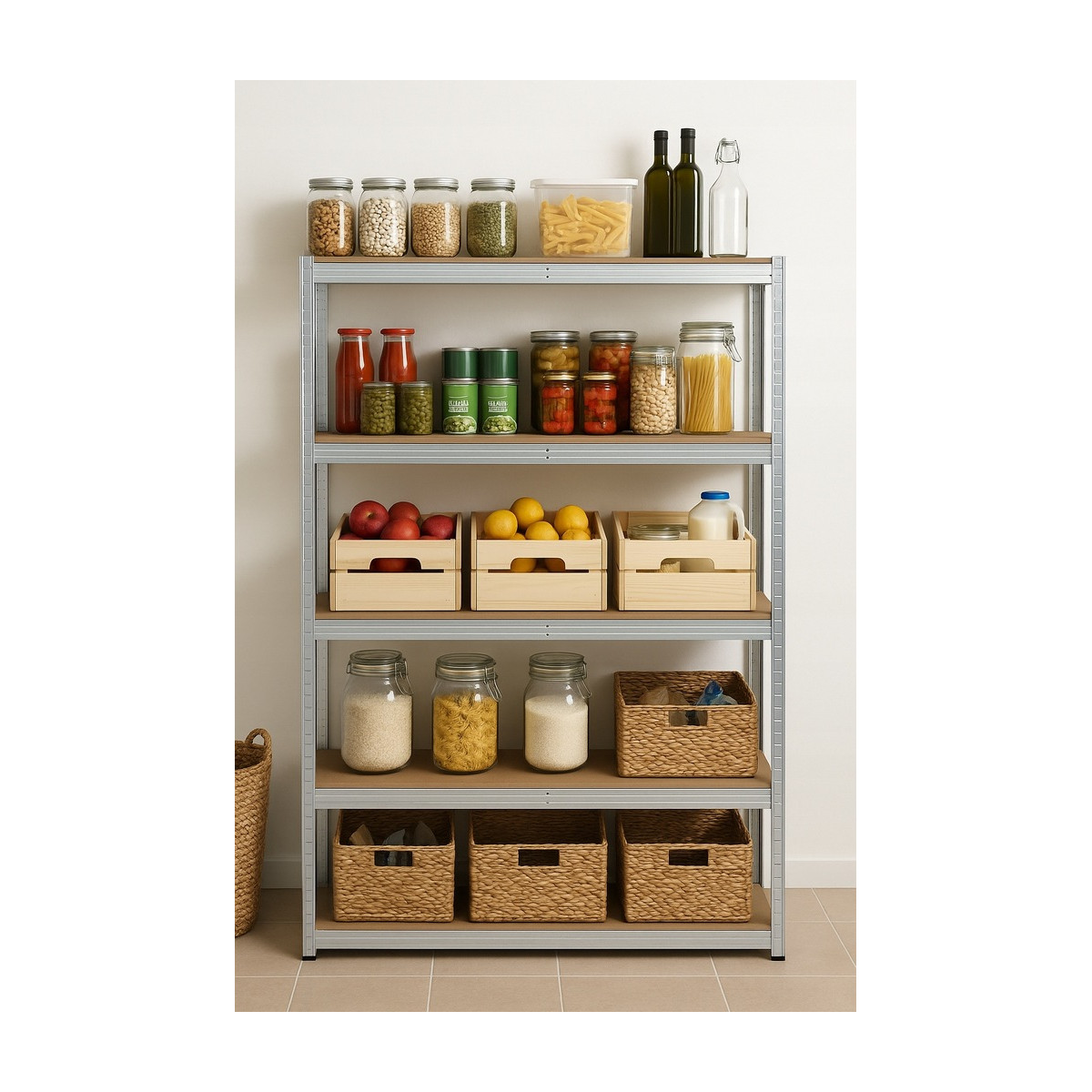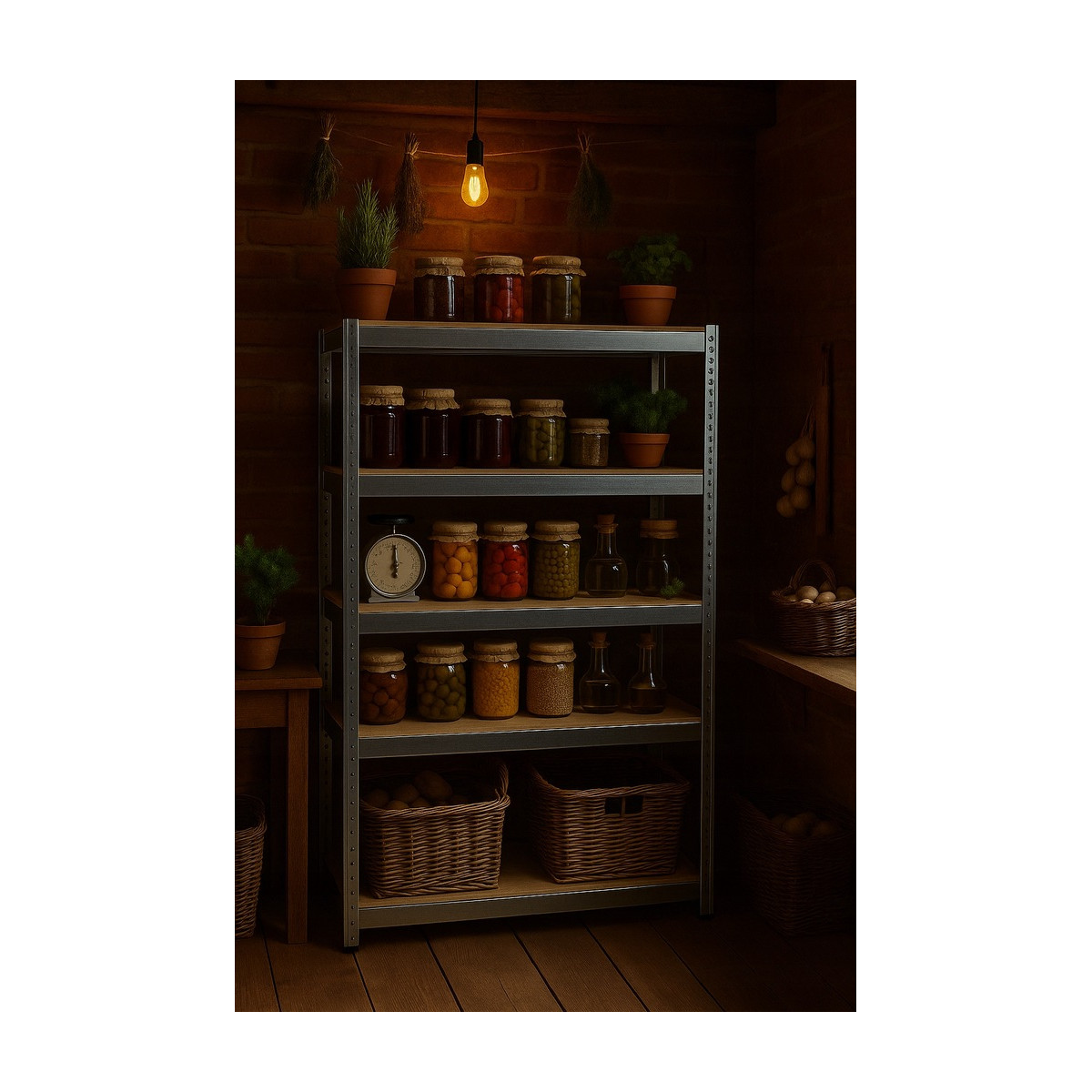Veľký kovový regál s 5 MDF policami a celkovou nosnosťou až 875 kg. Zosilnená pozinkovaná konštrukcia s dvojitými stredovými výstuhami, nastaviteľná výška políc, bezskrutkový montážny systém a možnosť rozdelenia na dva samostatné moduly. Ideálny do garáže, dielne, pivnice alebo skladu.