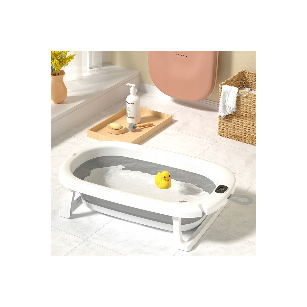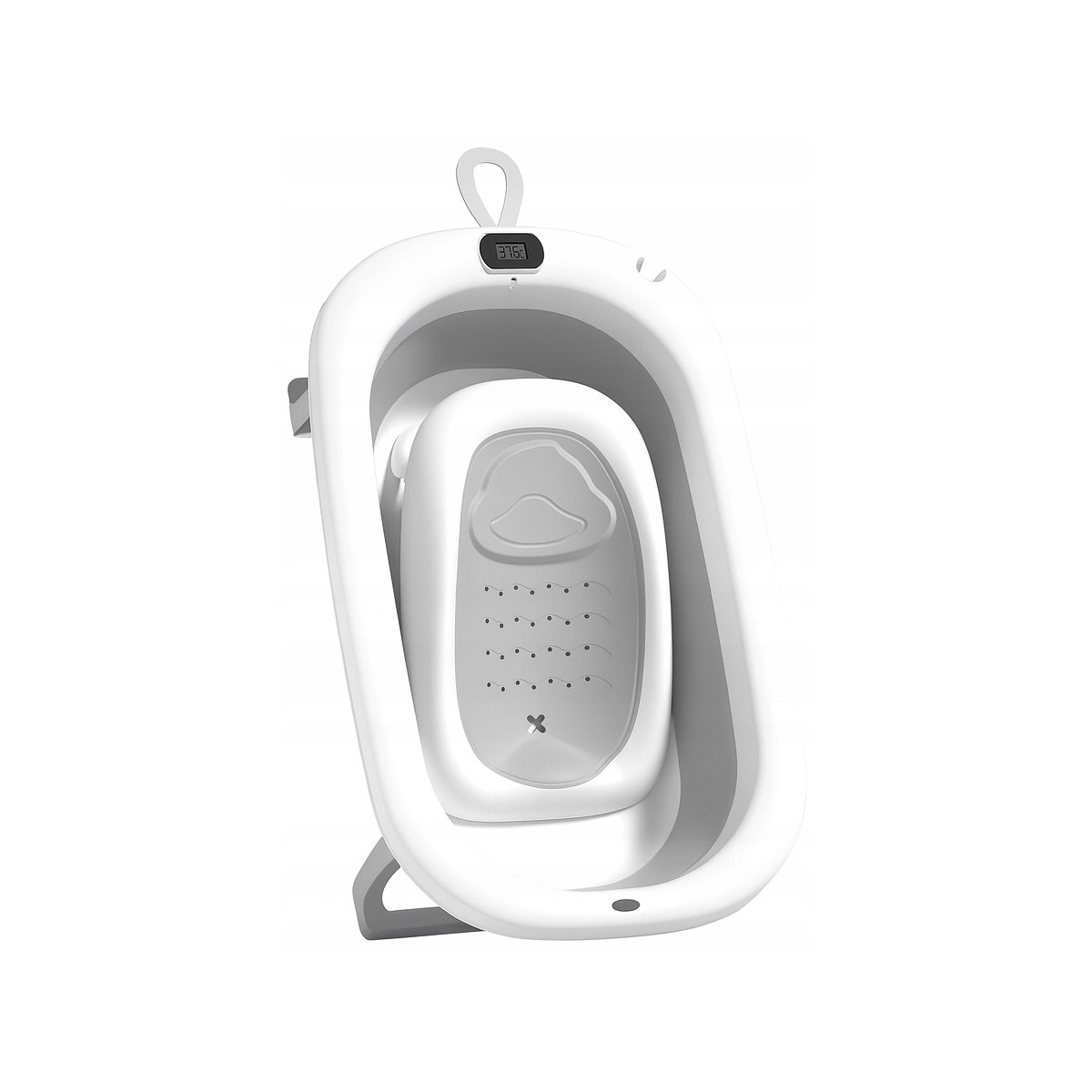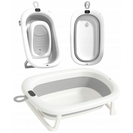 Skladacia detská vaňa ARIEL s integrovaným termometrom a mäkkou poduškou je ideálna voľba pre bezpečné a pohodlné kúpanie novorodenca. Vďaka skladacej konštrukcii zaberá iba cca 10 cm výšky, čo uľahčuje skladovanie v malej kúpeľni. Dodatočné funkcie ako protisklzové nožičky, odtokový ventil s korkom, držiak na sprchu a odnímateľná poduška z nej robia multifunkčný a praktický doplnok pre rodičov.