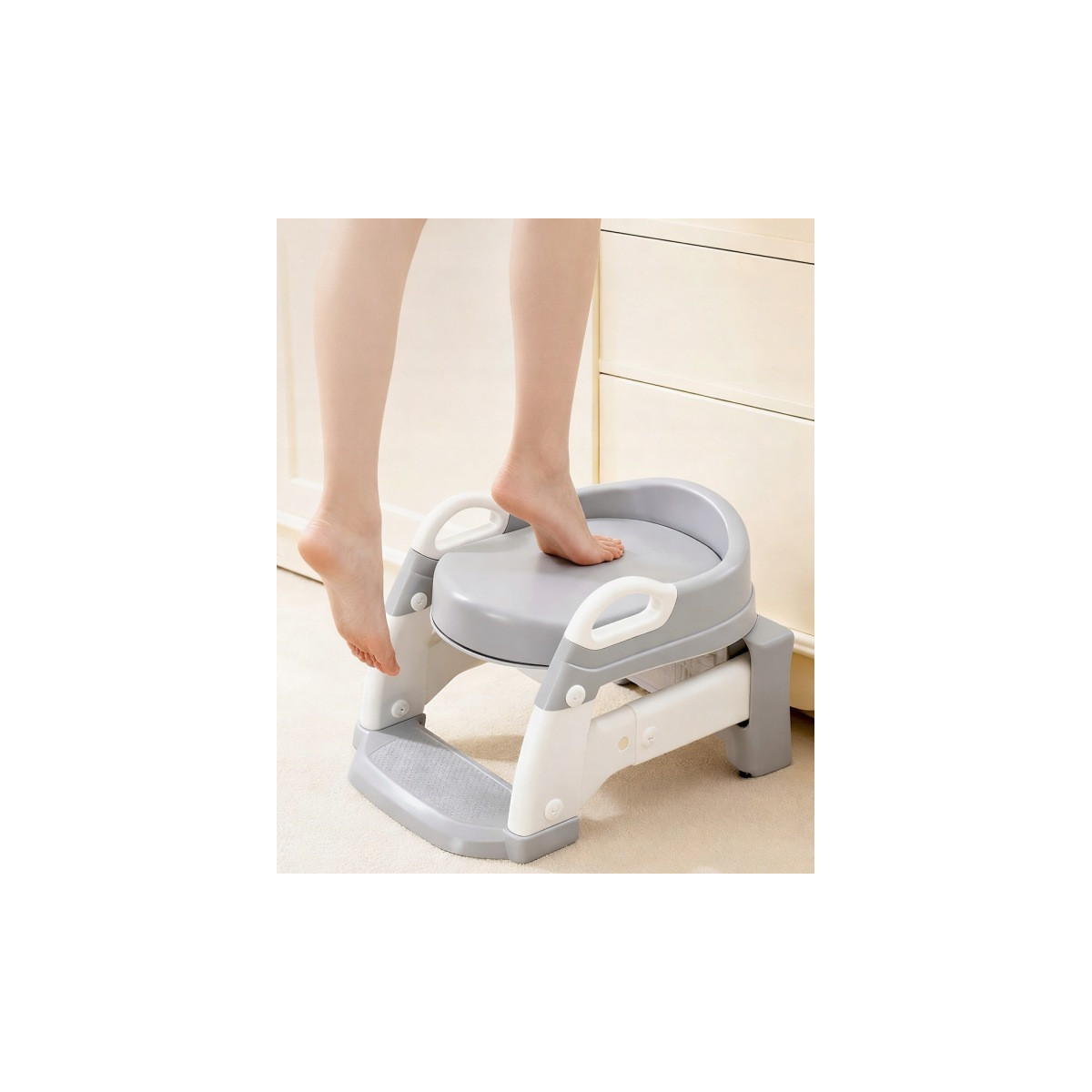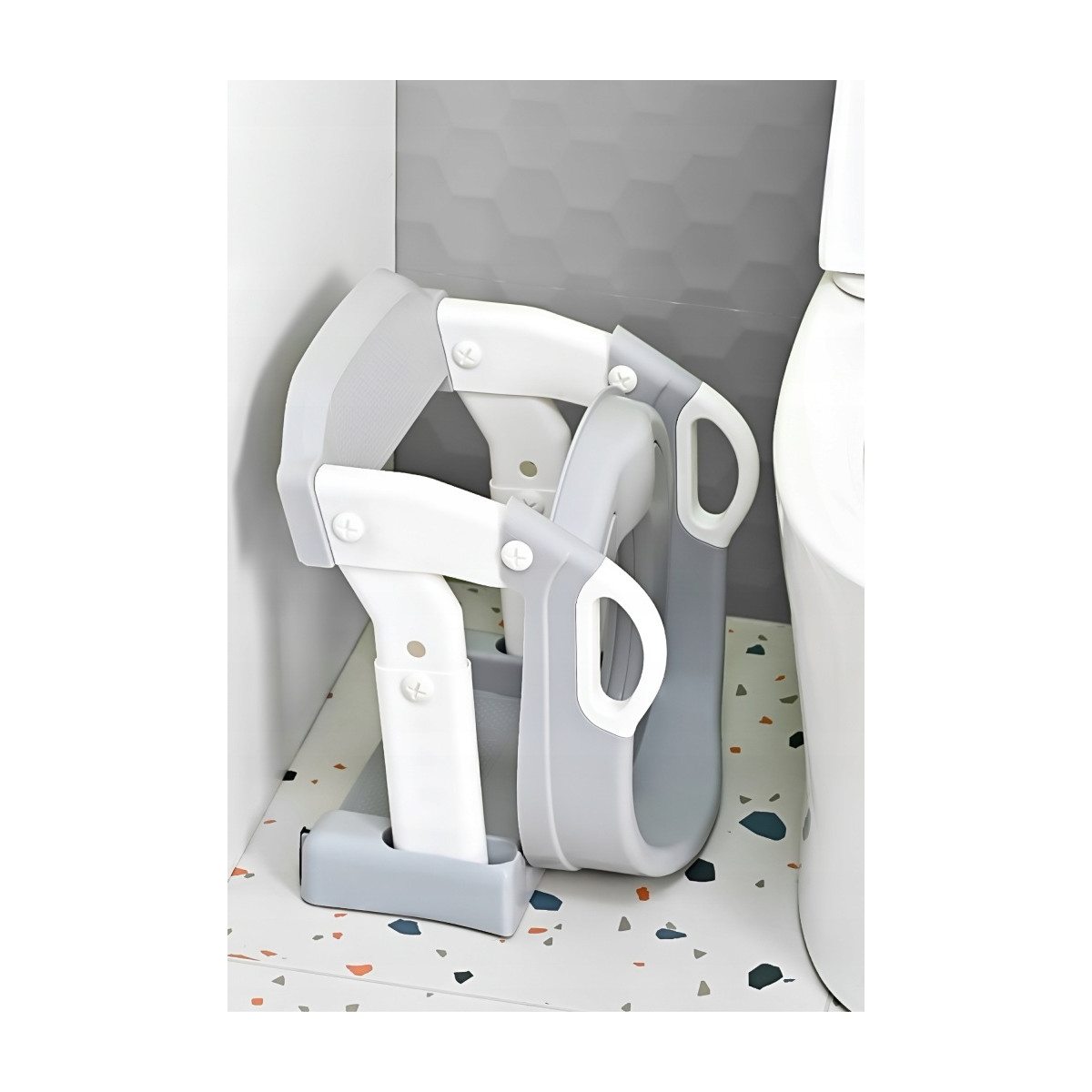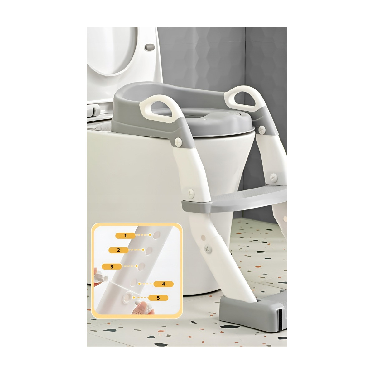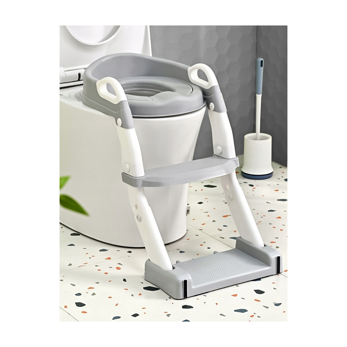 Praktická detská redukcia na toaletu 3v1 s rebríkom v sivej farbe. Slúži ako nočník, WC sedátko aj podstavec. Bezpečné a stabilné riešenie pre jednoduchý prechod dieťaťa na klasickú toaletu.