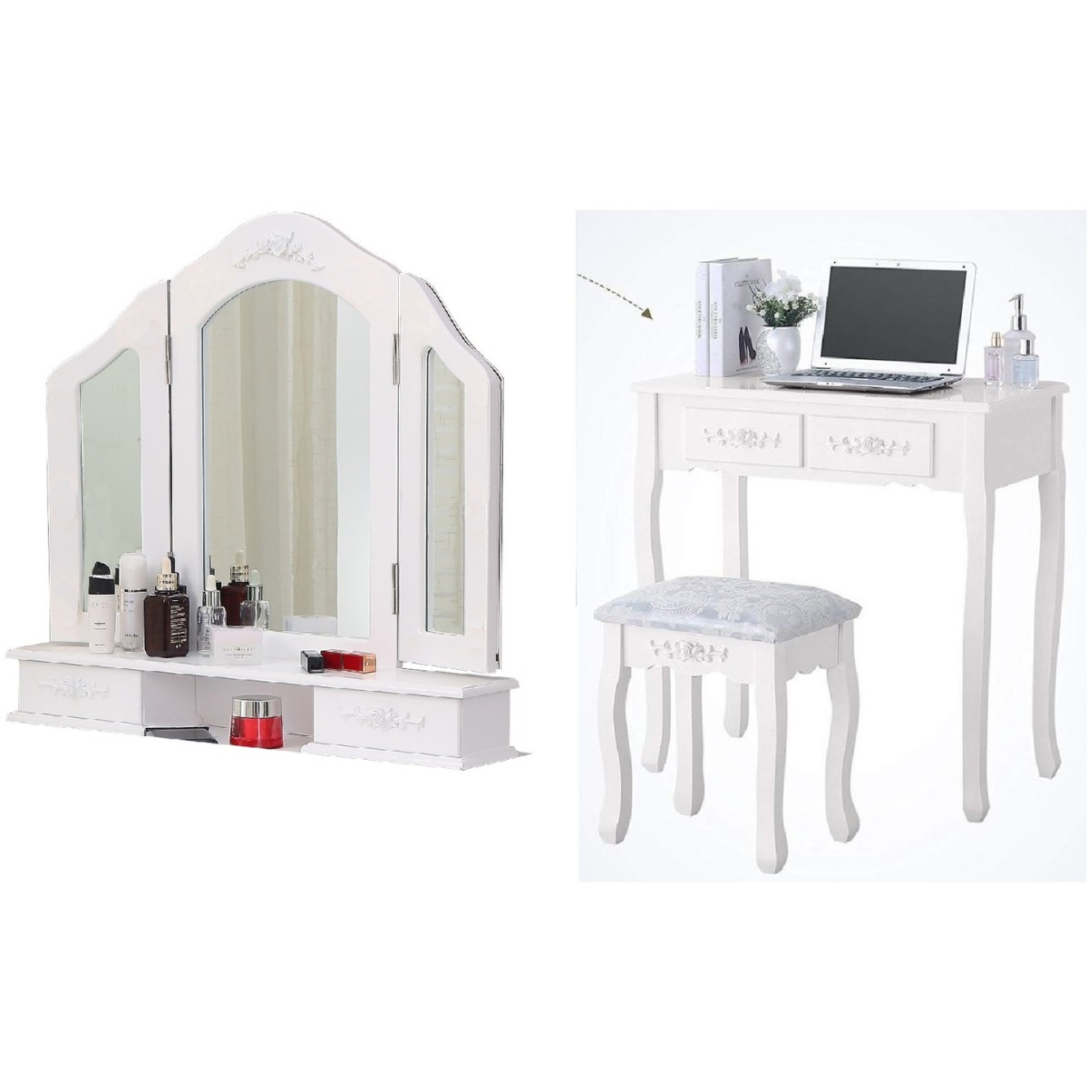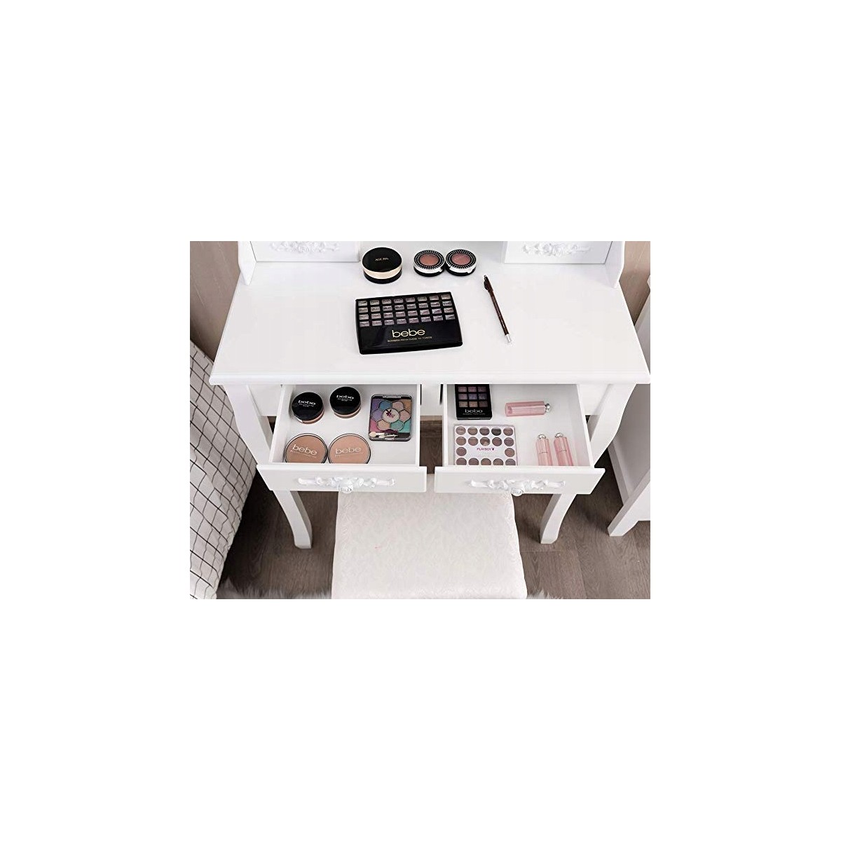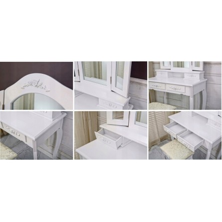 Toaletný stolík má 3 pohyblivé zrkadlá, ktoré sa v prípade potreby dajú odmontovať aj s celou konzolou a v okamihu použiť toaletný stolík ako stolík alebo písací stôl.