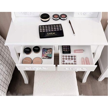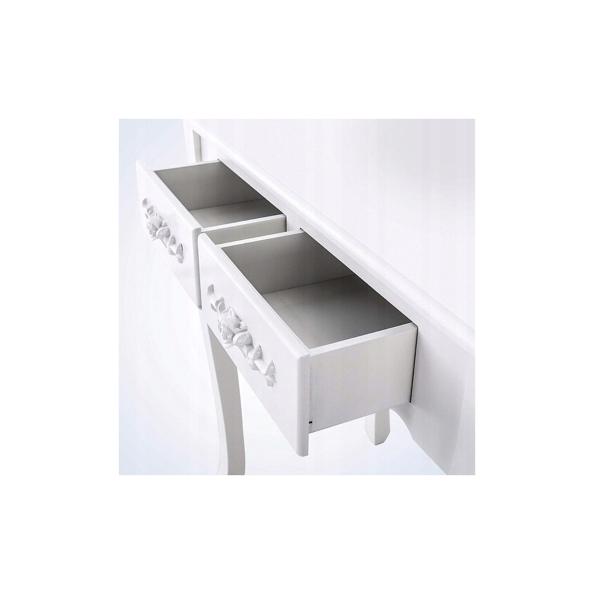 Krásny toaletný stolík na profesionálne aj amatérske použitie pre dámu, ktorá ocení pohodlie a eleganciu vo svojom domove. Súčasťou je kozmetický toaletný stolík s pohyblivými zrkadlami a pohodlnou stoličkou. Priestranné 4 zásuvky so zdobenými úchytkami pojmú všetko potrebné náčinie a skrášľujúce doplnky.