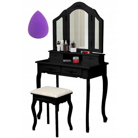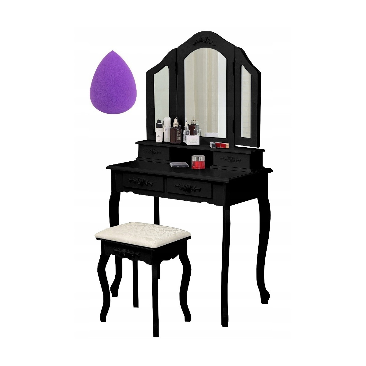 Čierny toaletný kozmetický stolík na líčenie so zrkadlom, zásuvkami a taburetom