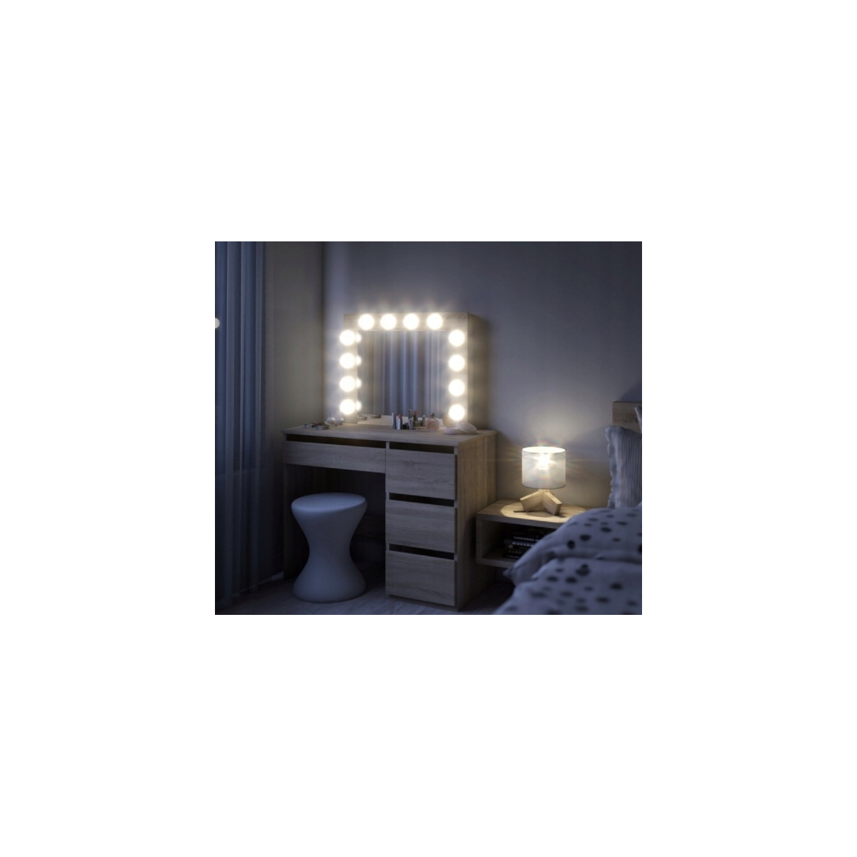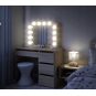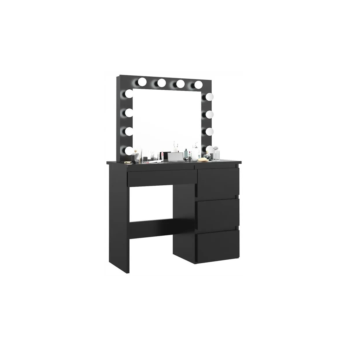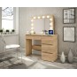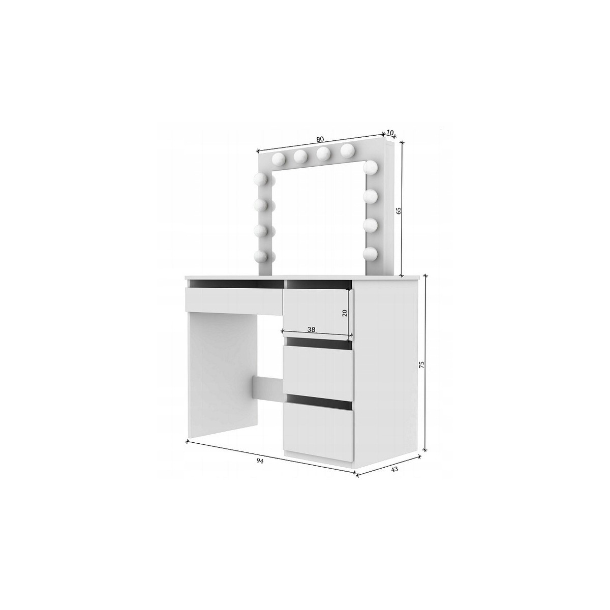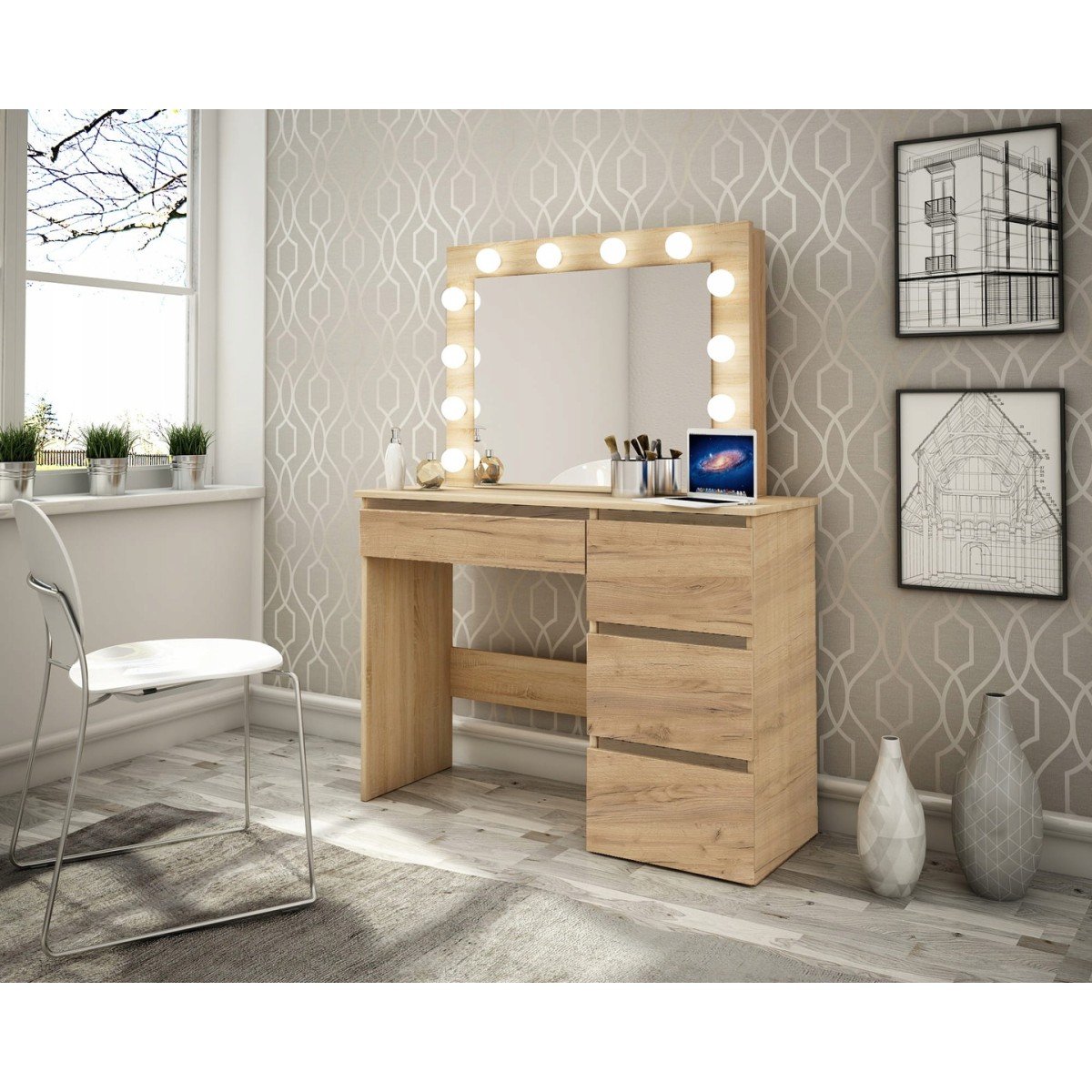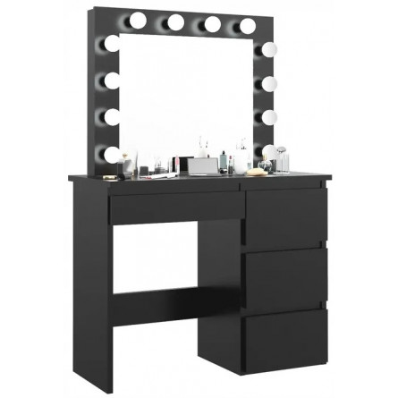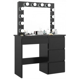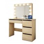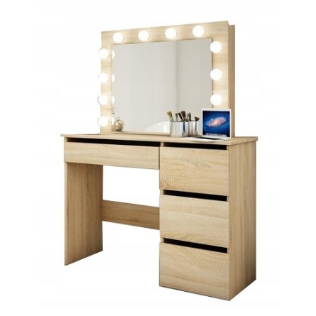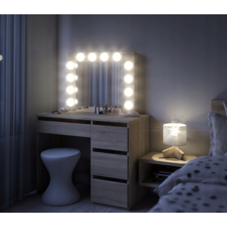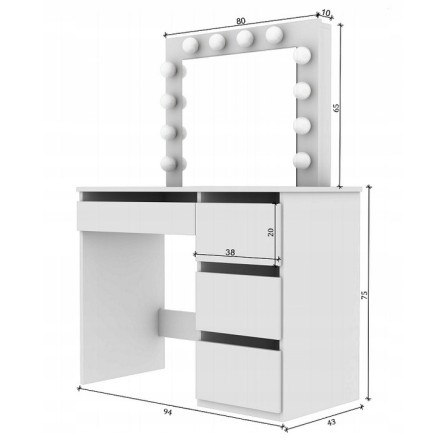 Toaletný stolík má veľké zrkadlo s LED osvetlením a 4 priestranné zásuvky, do ktorých sa zmestia všetky potrebné doplnky a kozmetické doplnky. Zásuvky sú ideálne aj na uloženie šperkov.
