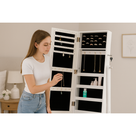 Túžite po elegantnom a praktickom mieste na svoje šperky a kozmetiku? Štýlová šatňa na šperky s veľkým zrkadlom je riešením, ktoré spája funkčnosť s krásnym dizajnom. Vďaka nej budú všetky vaše poklady vždy po ruke a interiér získa výnimočný akcent. Je to tiež ideálny darček na Valentína, narodeniny alebo výročie – praktický, elegantný a plný triedy.