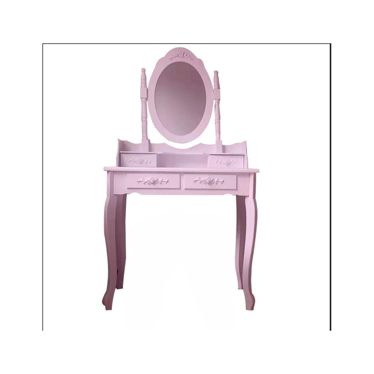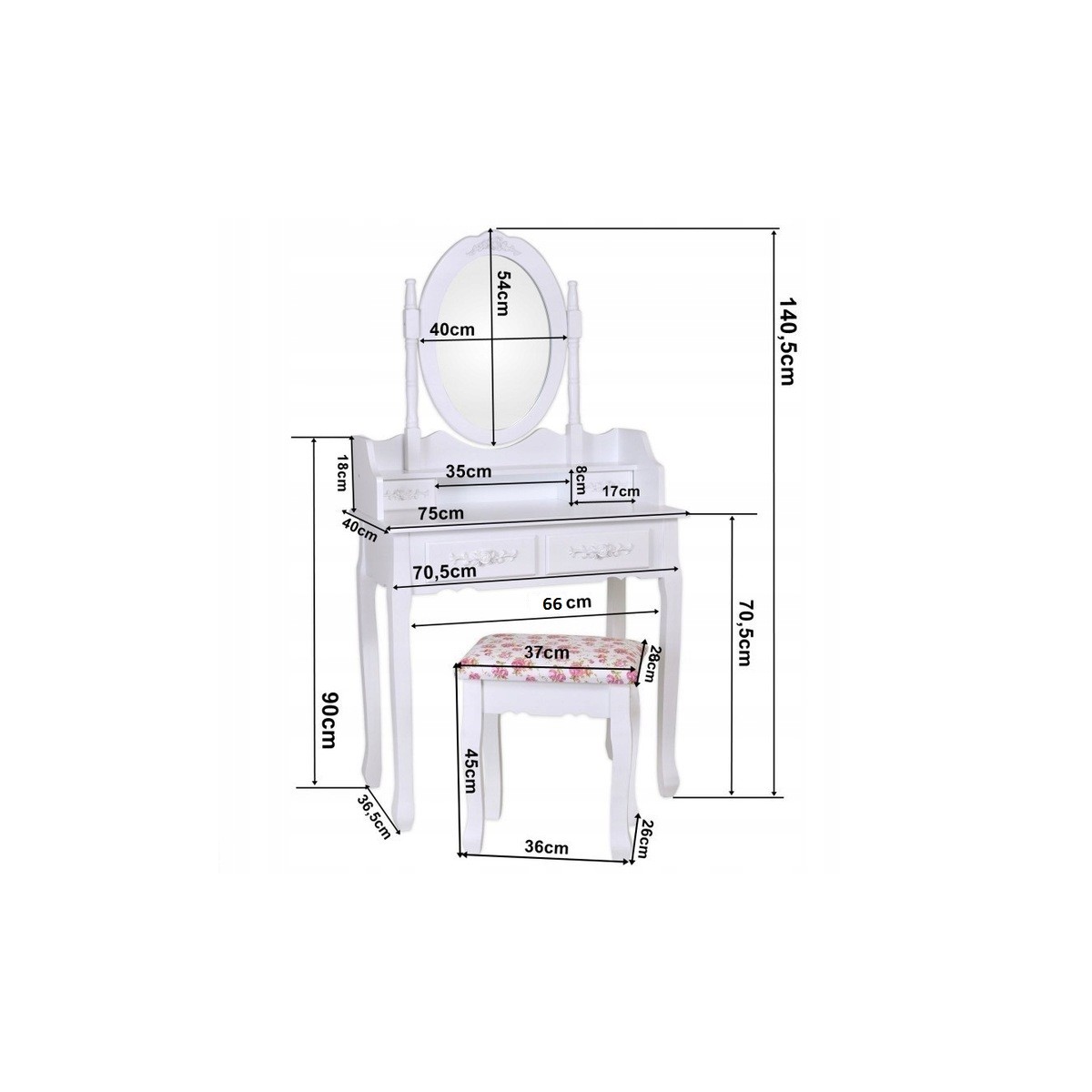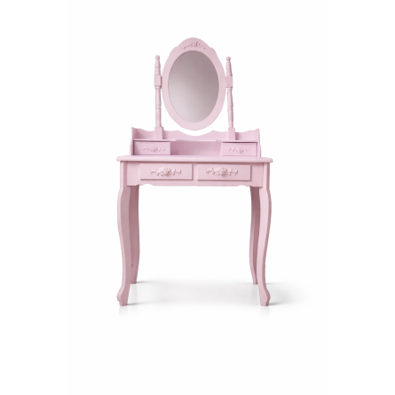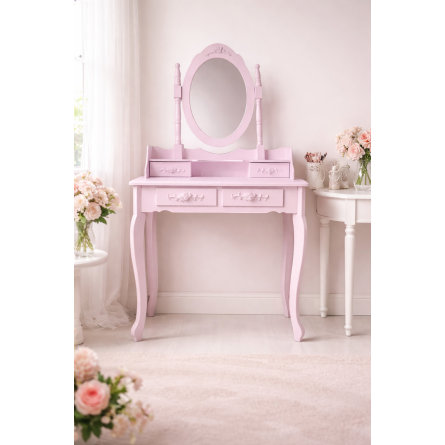 Krásny toaletný stolík pre každú dámu, ktorá ocení pohodlie a eleganciu vo svojom domove. Súčasťou je kozmetický toaletný stolík so sklopným zrkadlom a pohodlnou stoličkou. Vyrobené vo vintage štýle so vzormi ruží, zaobleniami a ozdobami. Do štyroch zásuviek sa určite zmestia šperky a kozmetika. Toaletný stolík má pohyblivé oválne centrálne zrkadlo.
