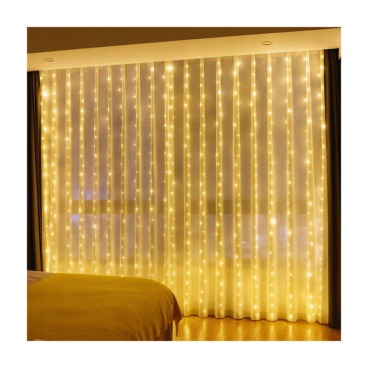 Náš svetelný záves s rozmermi 3x3 metre a 300 LED diódami je dekoráciou, ktorá premení každý interiér. Jemné, teplé biele svetlo vytvára útulnú a elegantnú atmosféru – ideálne na sviatky, romantické večery, večierky alebo ako každodennú dekoráciu miestnosti.
