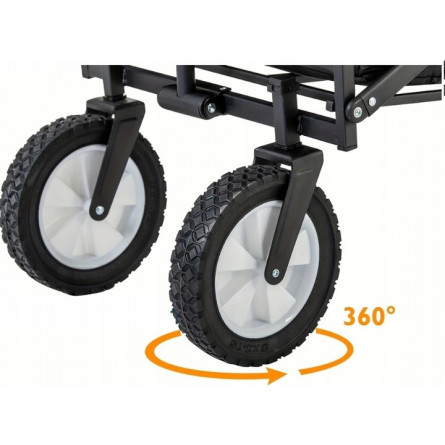 Multifunkčný a odolný vozík – skvele sa hodí na prácu na záhrade alebo pozemku. Vhodný aj na dovolenku – pláž, kemping, les. Využiteľný na prevoz nákupov, vybavenia a akéhokoľvek menšieho nákladu. Vozík je vyrobený z kovového rámu a vodoodolného materiálu. Maximálne rovnomerné zaťaženie: do 70 kg. Kolesá otočné o 360° zaručujú plynulý pohyb aj na piesku či nerovnom povrchu.