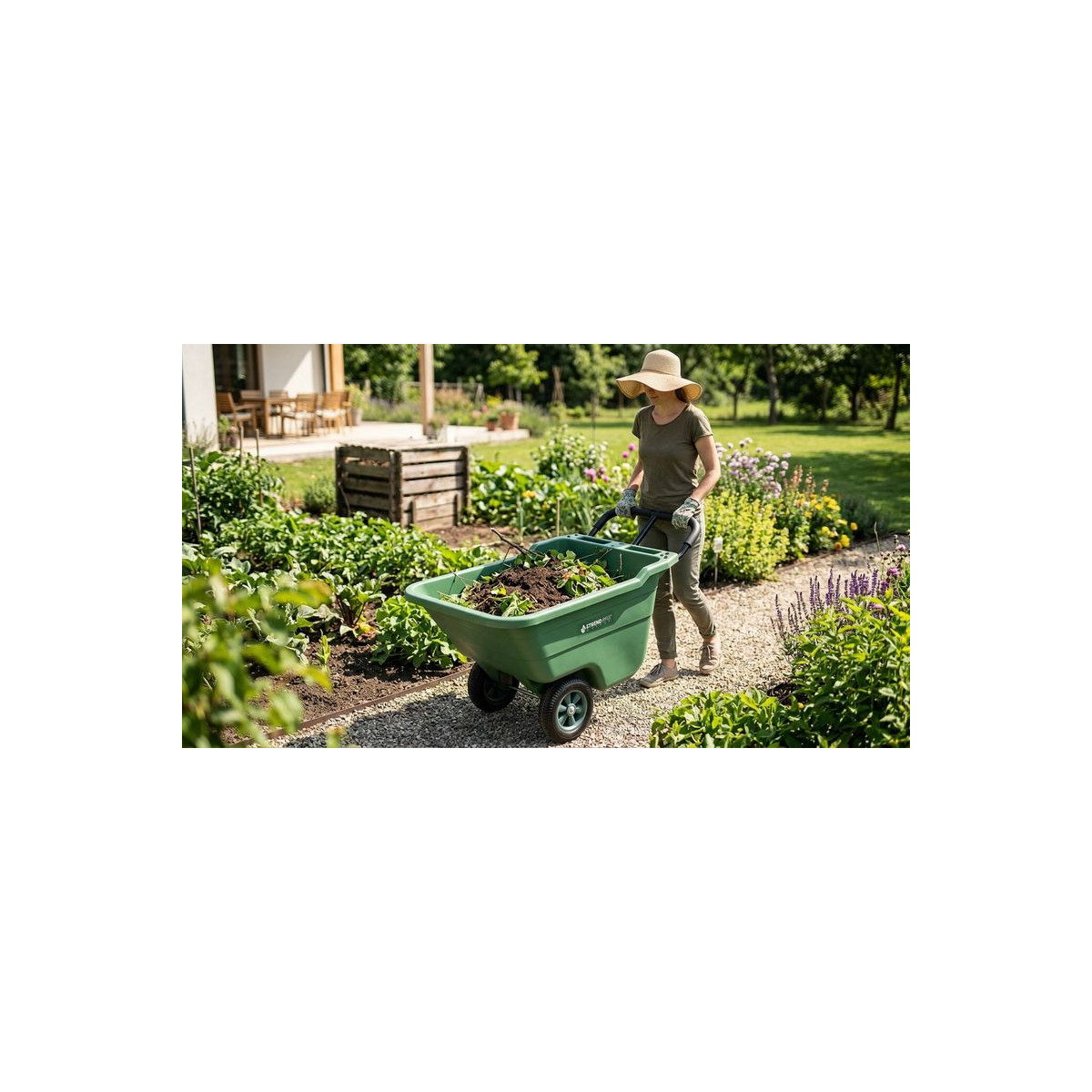 Odolné plastové korito je ľahké, pevné a nenáročné na údržbu. Nosnosť 50 kg postačuje na bežné záhradné práce, pričom vozík sa ľahko ovláda aj v menších priestoroch.