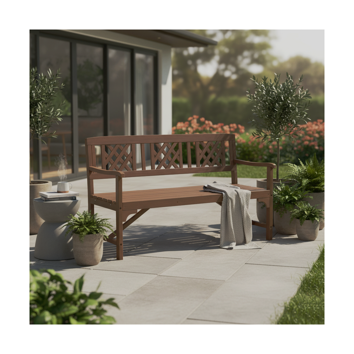 Lavička ponúka dostatočne široké sedadlo, ktoré zabezpečuje komfort aj pri dlhšom sedení. Opierka chrbta a praktické opierky na ruky zvyšujú pohodlie a umožňujú príjemný relax počas teplých dní aj večerného posedenia.